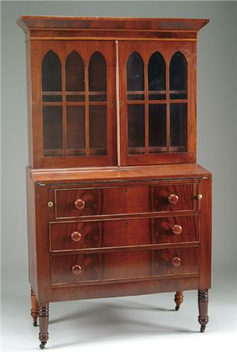 TWO PART SHERATON MAHOGANY SECRETARY. The top section fitted with two glass doors having cathedral shaped windows behind which are two shelf areas and three drawers. The bottom section with fold over writing surface, three drawers each having wooden turned knobs all resting on turned legs with castor feet. SIZE: 72in. h x 40in. w x 18in. d. CONDITION: Very good. 9-26369