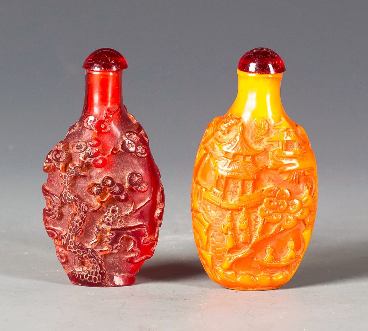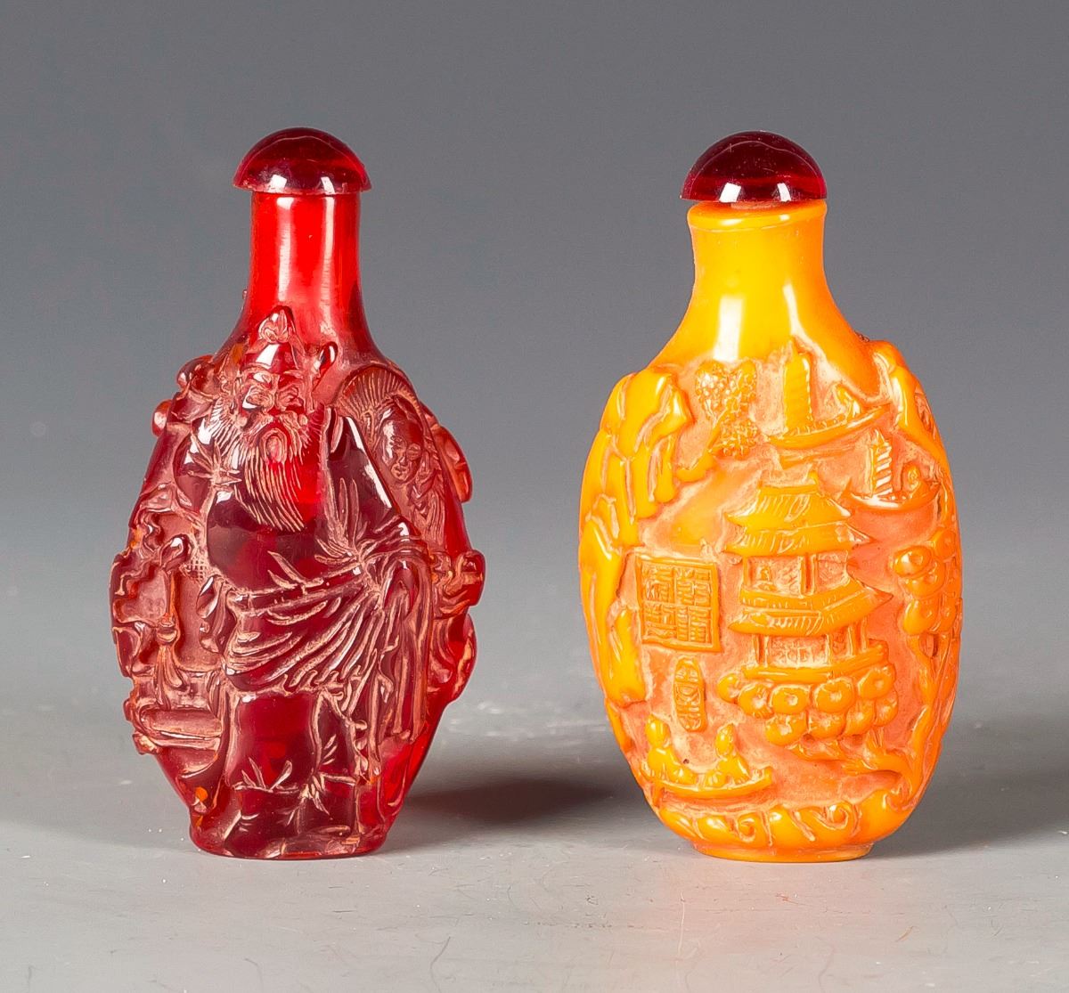 Two Peking Snuff BottleS, one being red and another being yellow, with landscape motif, surmounted with Peking red cap. Length 1.75" Width 1" Height 3.25" (Yellow one) Length 1.75" Width 1" Height 3.25"(Red one)
