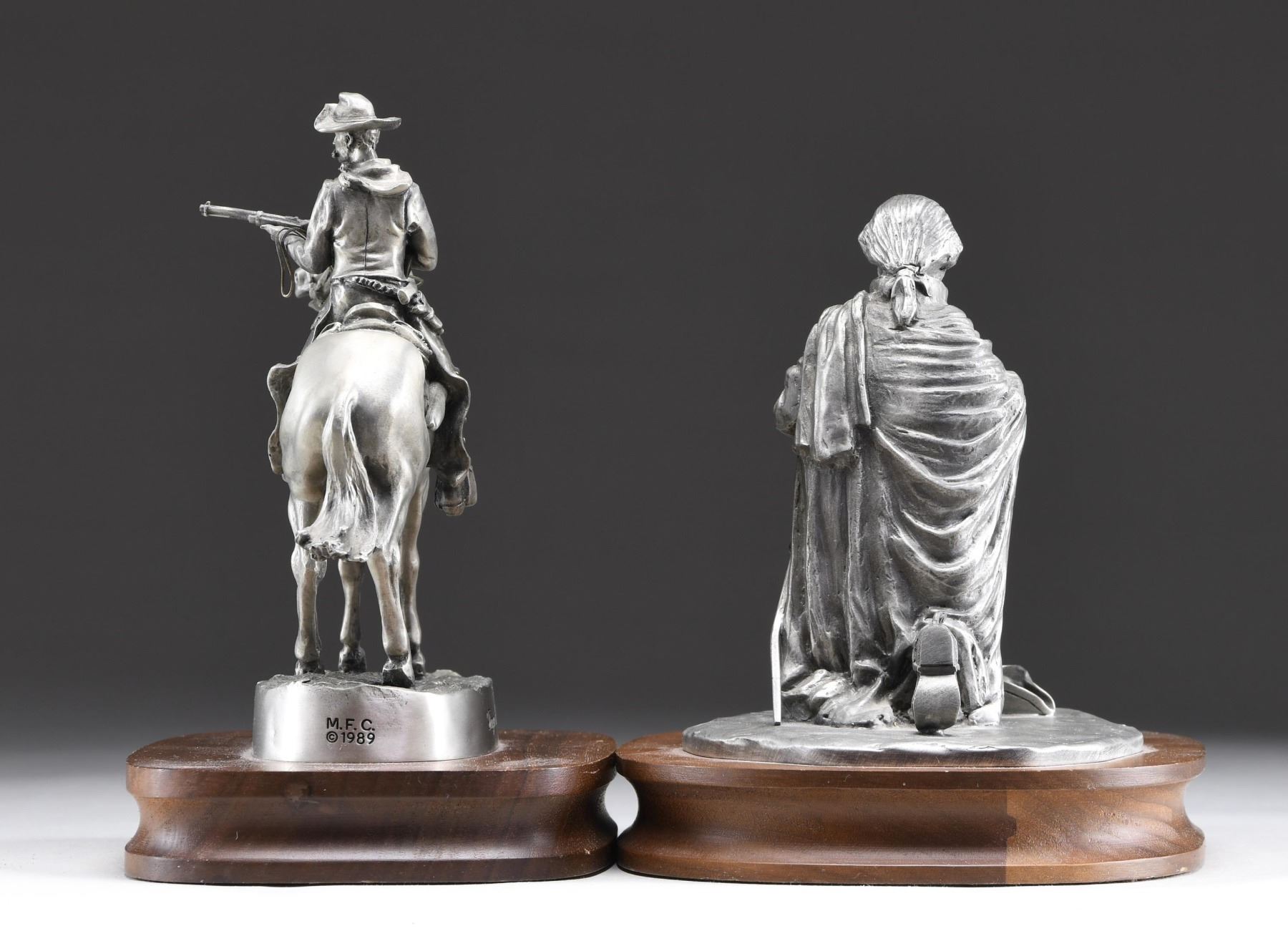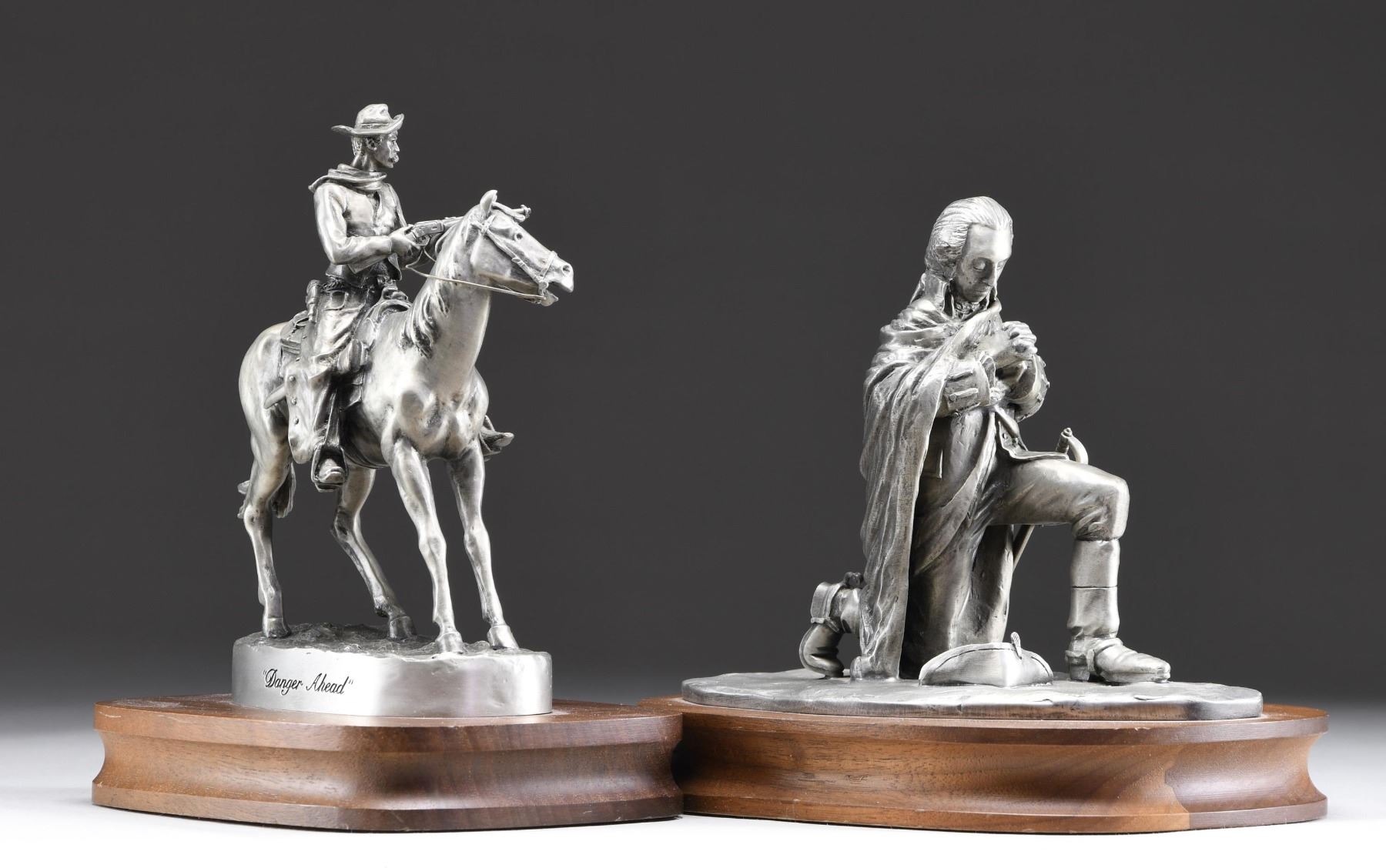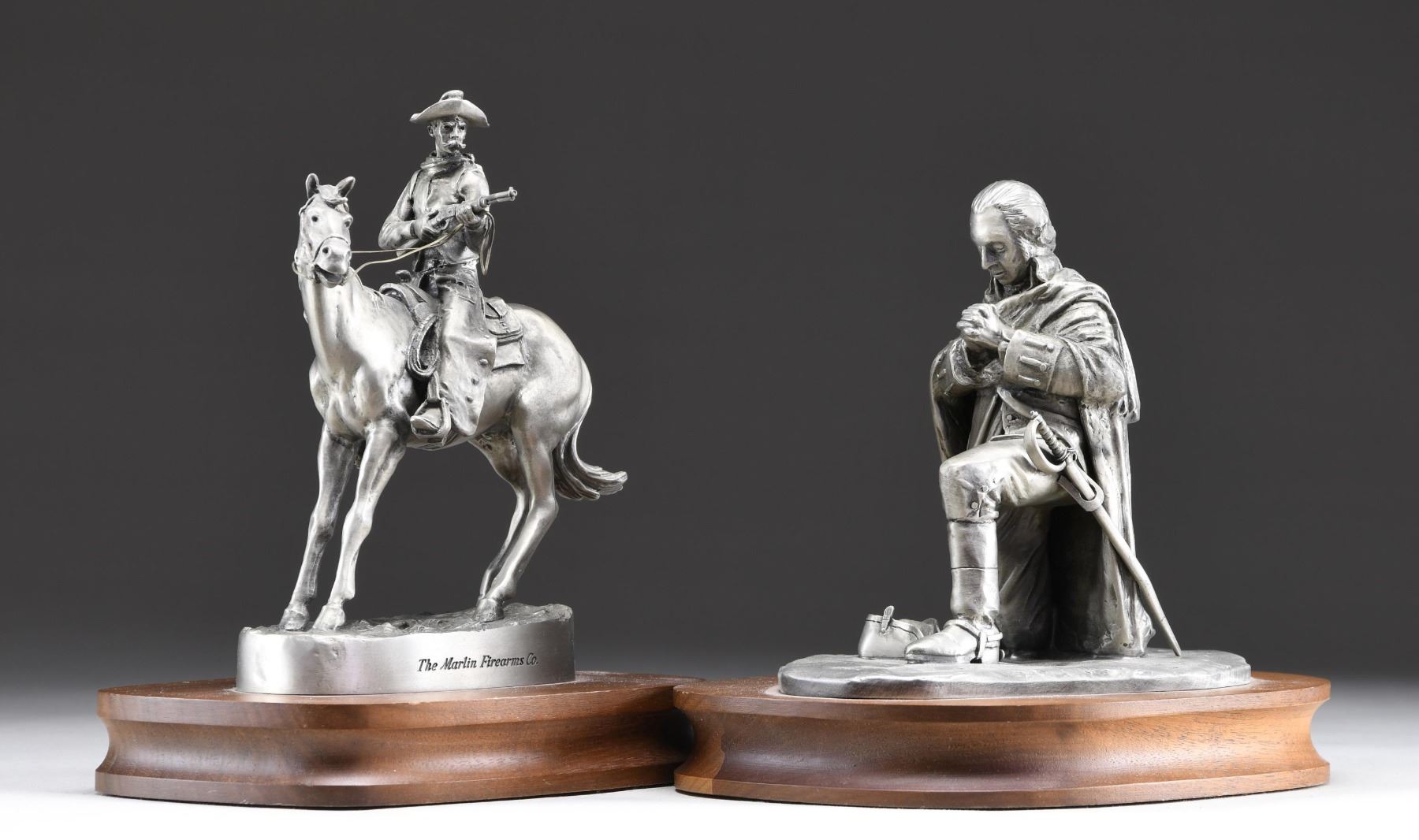COLONEL WILLIAM S. BROPHY. These two statues are executed in pewter & have rounded walnut bases. No.1: figure of the Marlin Horse & Rider. The metal base is marked "DANGER AHEAD" & "THE MARLIN FIREARMS CO.". The rounded walnut base measures approx. 4 1/2" by 6". The figure stands approx. 7 1/2" tall. Base is marked underneath "Bristol Pewter North Attleborough Mass". CONDITION: statue is in very good condition w/ only scattered tiny handling marks on the wooden base. Statue is slightly loose on the base. No.2: figure of General George Washington kneeling in prayer in the snows of Valley Forge. George Washington in a winter cloak, wearing his sword has clasped hands. Statue is unmarked. CONDITION: statue is in very good condition w/ the base having only tiny handling marks. PROVENANCE: letter dated February 17, 2025, "To whom it may concern, The lot consists of two detailed pewter statues on wooden bases. These stood on the desk of Lt. Col. William S. Brophy (Ret). Thank you. Best regards, Gail Brophy Barry". (02-24005/RW). NON-GUN. $100-300.