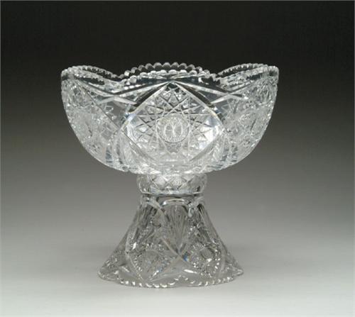 TWO PIECE CUT GLASS PUNCHBOWL and LADLE. Lovely punchbowl is cut in hobstar and fan patterns. Punchbowl is accompanied by a silverplated ladle. SIZE: Bowl is 12 in. dia. Overall height is 11-1/2 in. CONDITION: Pedestal base has rim chips, otherwise very good. Estate of Edwin Schiebel Sr. 5-60075