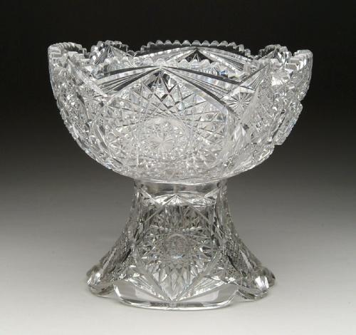 TWO PIECE CUT GLASS PUNCHBOWL. Two piece punchbowl is cut in hobstar and crosshatching pattern. SIZE: Bowl is 12 in. dia. Overall height is 10-1/2 in. CONDITION: Chip to top of pedestal, otherwise very good. Estate of Edwin Schiebel Sr. 5-60182