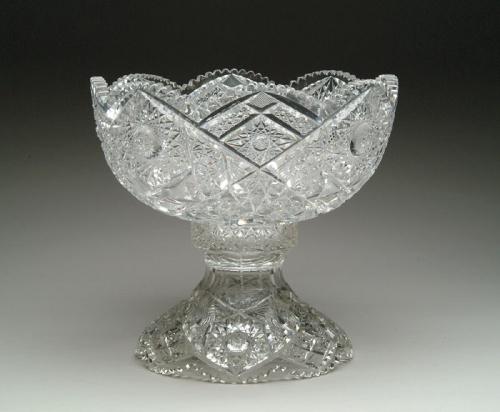 TWO PIECE CUT GLASS PUNCHBOWL. Wonderful two piece punchbowl is cut in hobstar and crosshatch pattern. SIZE: Bowl is 14 in. dia. Overall height 13 in.. CONDITION: Very good. Estate of Edwin Schiebel Sr. 5-60070