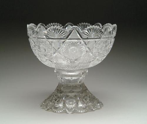 TWO PIECE CUT GLASS PUNCHBOWL. Two piece punchbowl is cut in hobstar, hobnail and fan patterns. SIZE: Bowl is 14 in. dia. Overall height is 13 in.. CONDITION: Chips to rim of bowl and base is cracked. Estate of Edwin Schiebel Sr. 5-60071