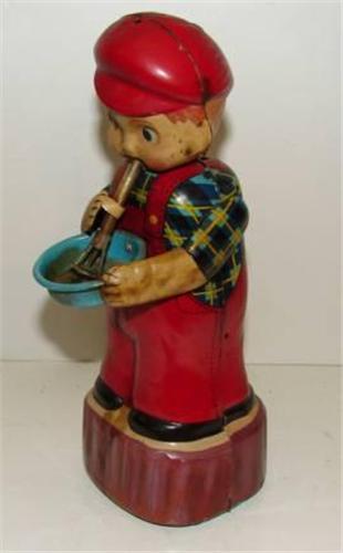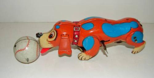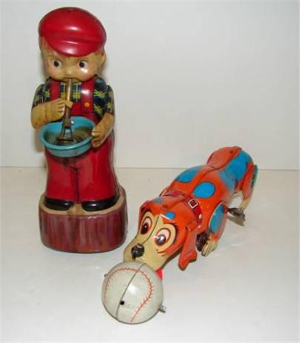 TWO PIECE LOT OF TIN LITHOGRAPH TOYS. Comprising a dog chasing a baseball and little boy in overalls.