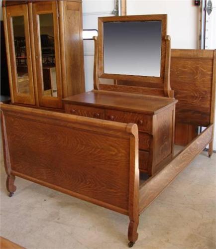 TWO PIECE OAK EMPIRE STYLE BEDROOM SUITE. Consists of sleigh bed (53” H, 54” W) and four drawer chest with mirrored back with two dovetailed drawers over two drawers (67.75” H, 44” W, 22.5” D). Has recently been refinished. Feet of bed and chest rest on castors.