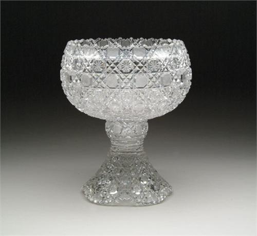 TWO PIECE PUNCHBOWL. Two piece punchbowl is cut in Harvard pattern. SIZE: Bowl is 10 in. dia. Overall height is 12 in. CONDITION: Slight edge roughness on bowl, otherwise very good to excellent. Estate of Edwin Schiebel Sr. 5-60066