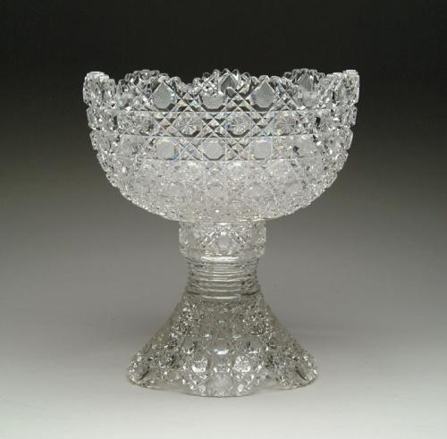 TWO PIECE PUNCHBOWL. Two piece punchbowl is cut in Harvard pattern. SIZE: Bowl is 12 in. dia. Overall height is 13-3/4 in. CONDITION: Chips to bowl and pedestal. Estate of Edwin Schiebel Sr. 5-60068