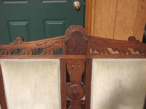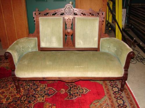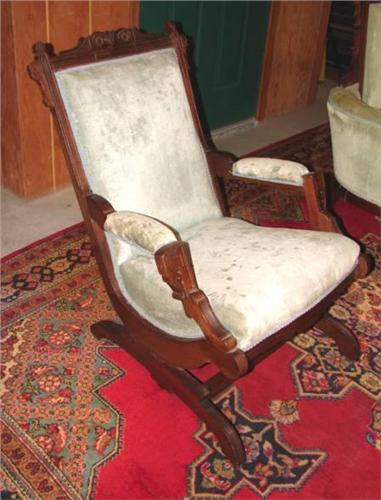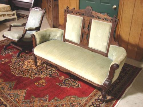 TWO PIECE VICTORIAN WALNUT PARLOR SET. Consists of love seat and platform rocker. Both have green velvet upholstery that shows signs of fading and soiling. Ornately carved and decorated. Loveseat: 41.5” H to top of back, 60” W. Rocker: 33.5” H to top of back, 24” W