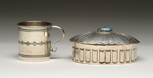 TWO PIECES OF SANTA FE SILVER. Both unmarked, unknown silver content. 1) 2-1/4in. h x 2-1/4in. dia handled cup with band decoration. 2) 2in. h x 4-1/2in. x 3-1/2in. covered soap dish having a rayed and paneled design with oval turquoise cabochon finial. CONDITION: Very good. 9-26290