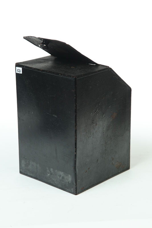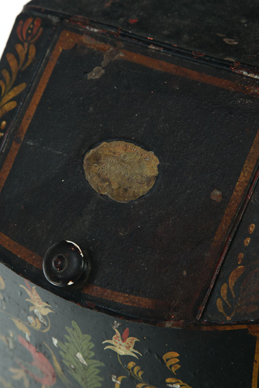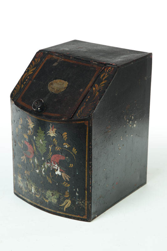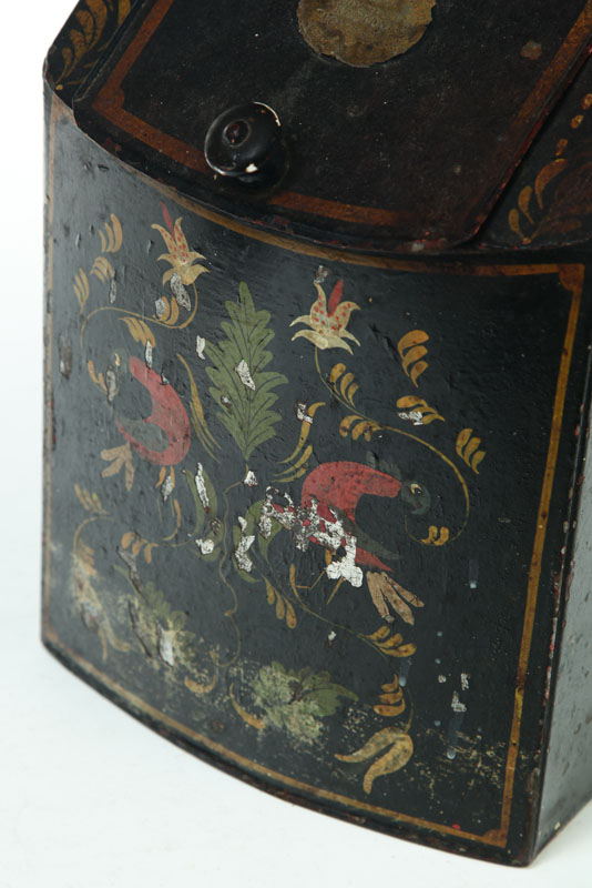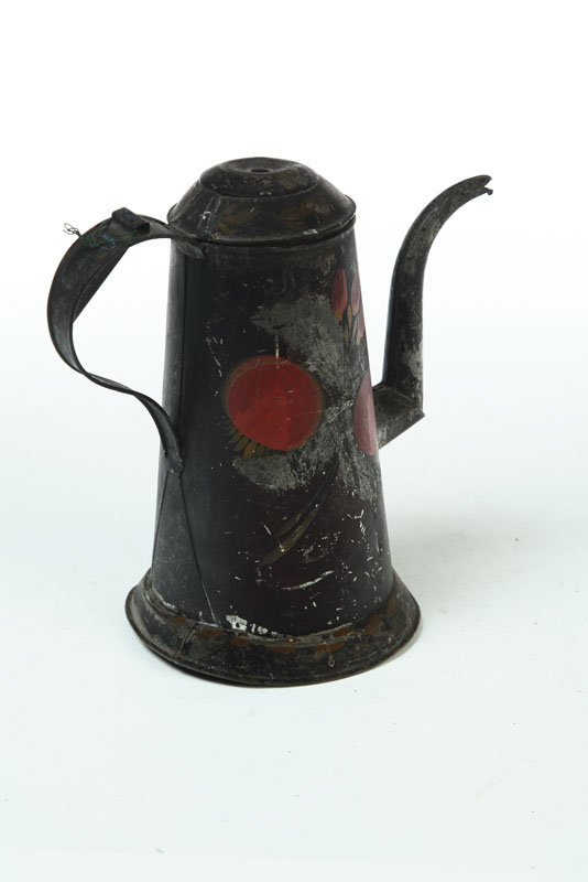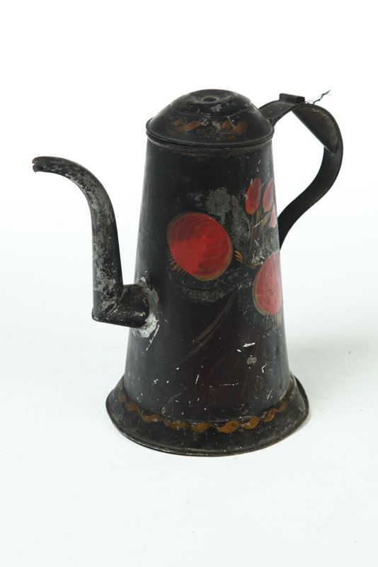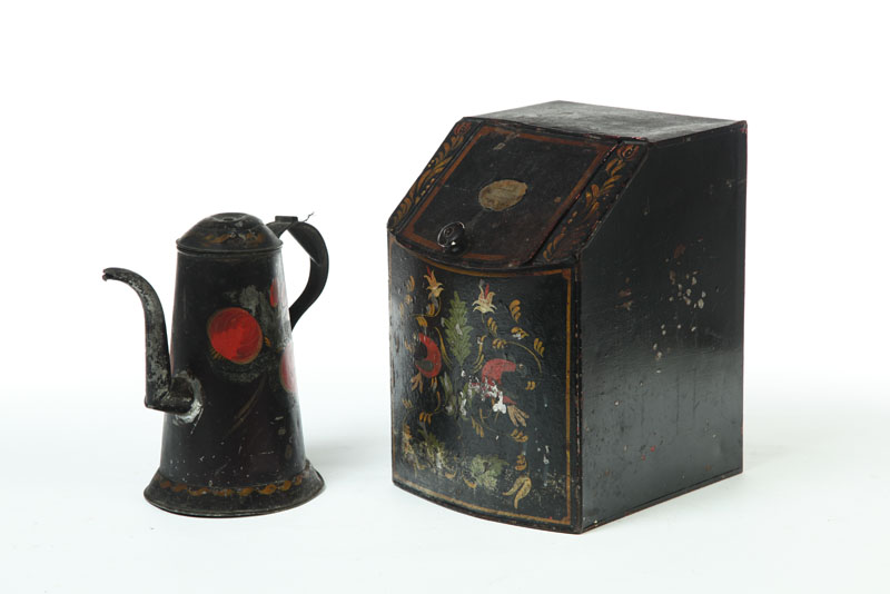 American, 2nd half-19th century. Store bin with later folksy bird decoration and brass label marked "Boston", 13"h., and a gooseneck coffee pot with original red floral designs, 10"h. Imperfections.