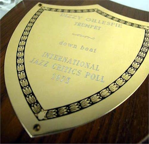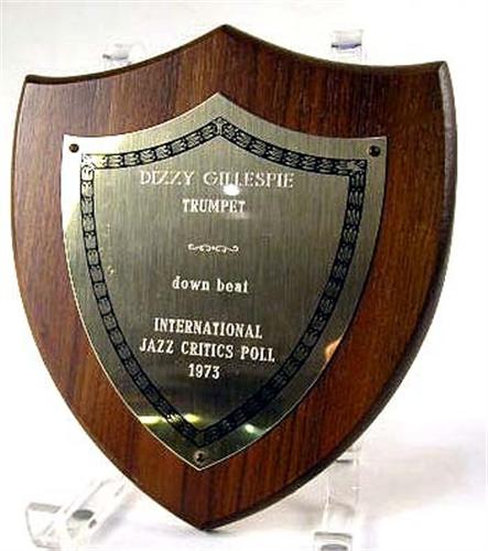 TWO PLAQUES FROM THE DOWNBEAT INTERNATIONAL JAZZ CRITICS POLL TO DIZZY GILLESPIE Dated 1972 and 1973, some wear