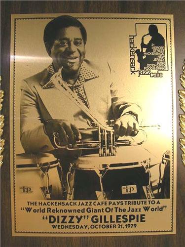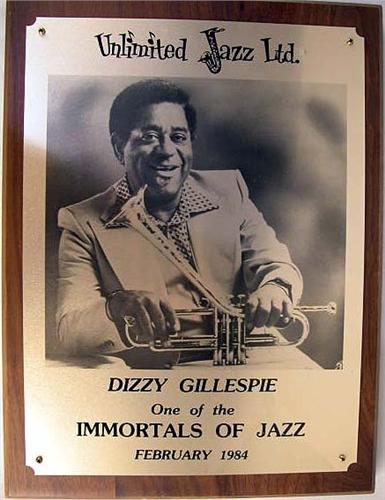 TWO PLAQUES ON GOLD TONE METAL WITH BLACK LETTERING Each with image of Dizzy in front of drums, holding trumpet, the first inscribed "The Hackensack Jazz Cafe Pays Tribute to a World Reknowned Giant of the Jazz World Dizzy Gillespie, Wednesday, October 31, 1979", and the second inscribed "Dizzy Gillespie, one of the mortals of jazz, February 1984, United Jazz Ltd.", some scratches