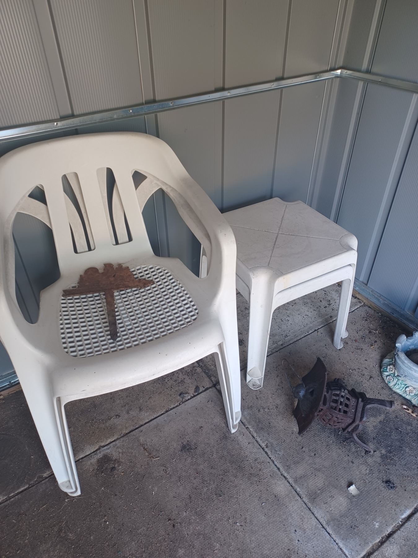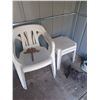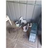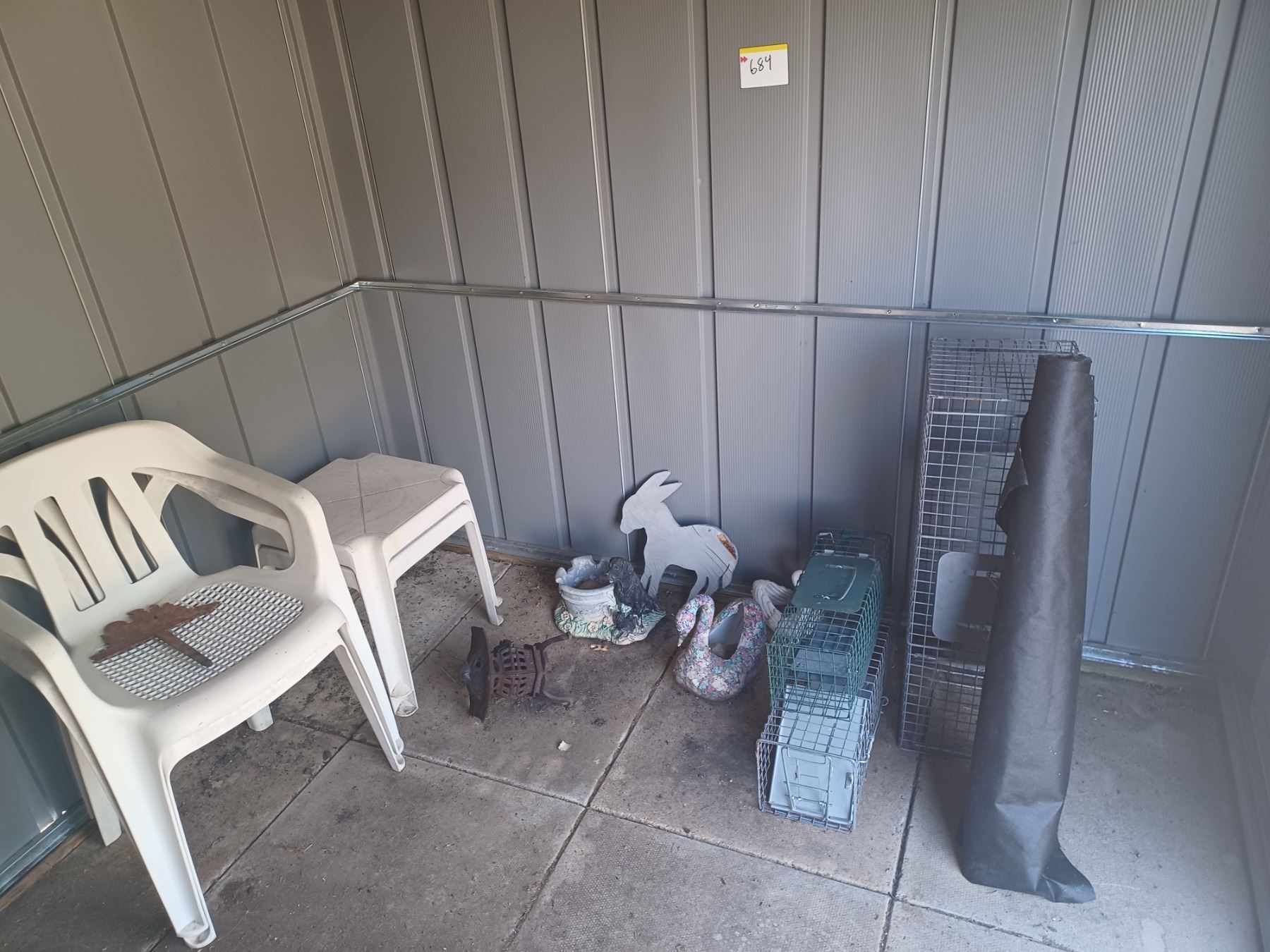 TWO PLASTIC PATIO CHAIRS, SIDE TABLES, ANIMAL SHAPED PLANTERS, THREE SMALL ANIMAL TRAPS, PARTIAL ROLL OF PLANTING FABRIC (ALL ITEMS ON RITE SIDE OF THE SHED)