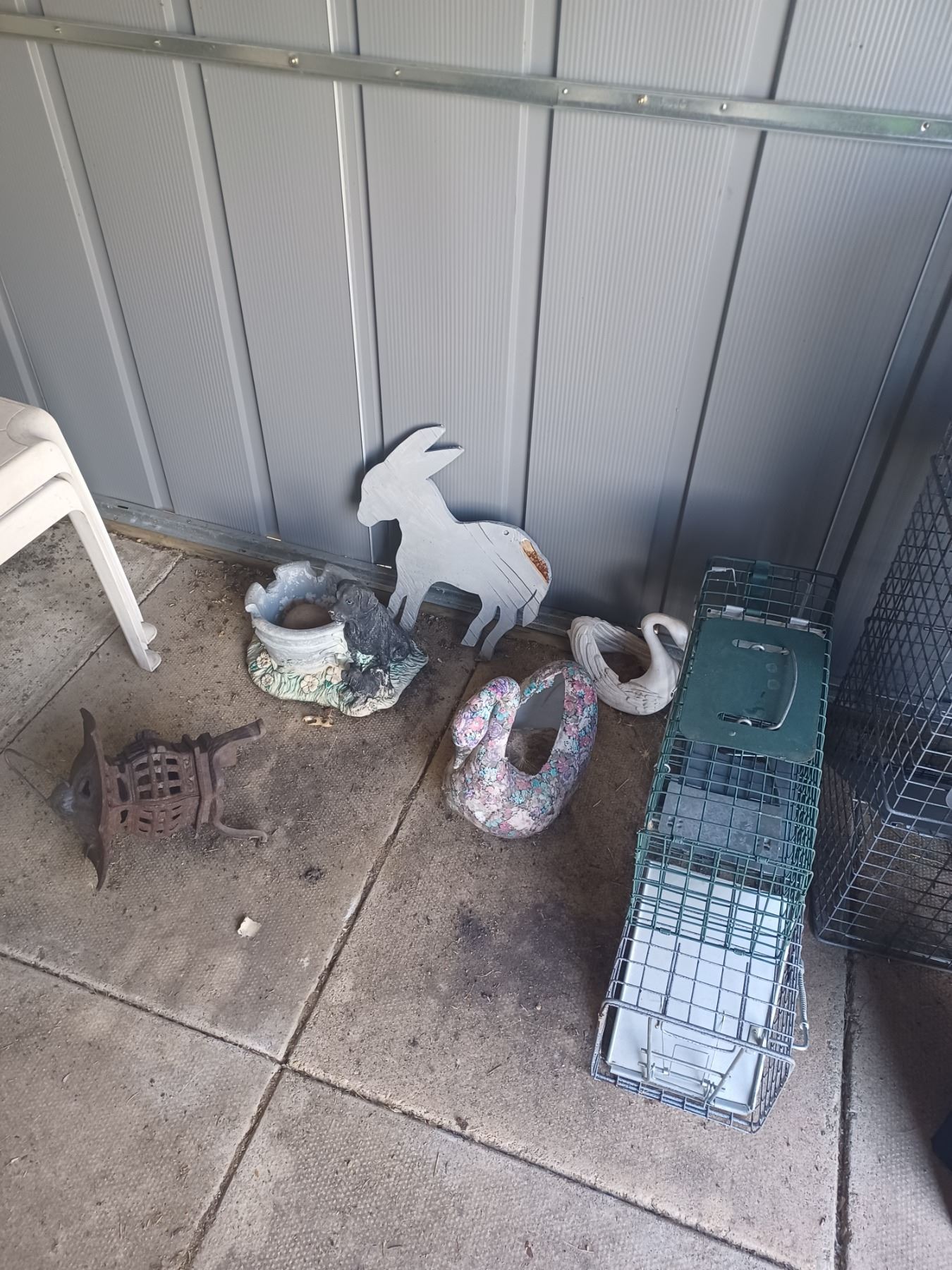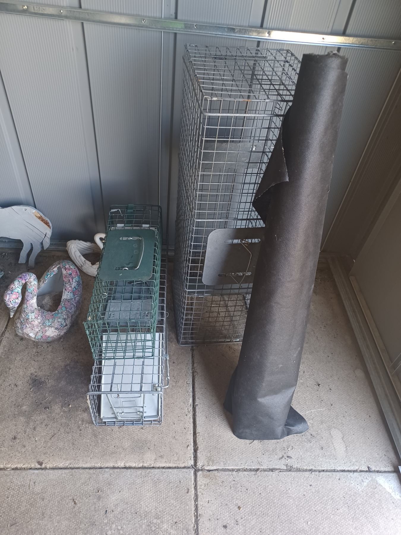 TWO PLASTIC PATIO CHAIRS, SIDE TABLES, ANIMAL SHAPED PLANTERS, THREE SMALL ANIMAL TRAPS, PARTIAL ROL