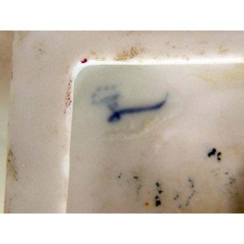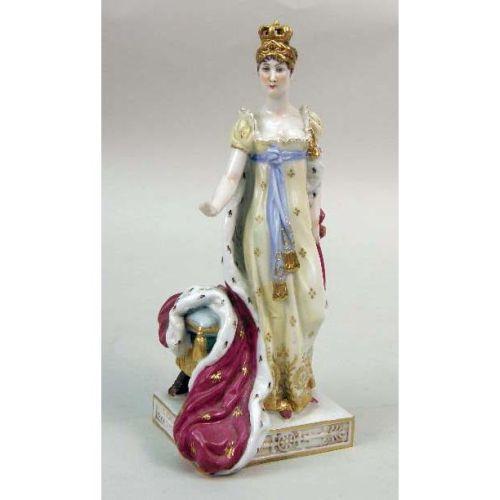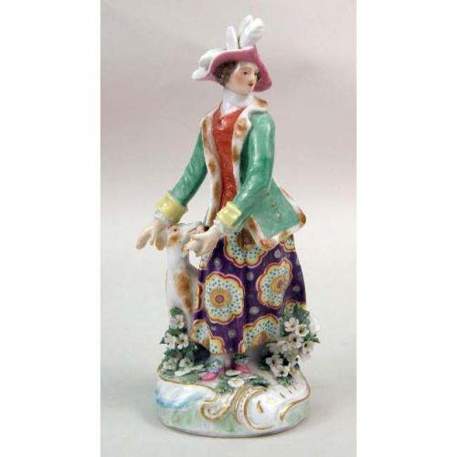 TWO POLYCHROME- PARCEL-GILT DECORATED PORCELAIN FIGURES<BR><BR>One depicting a gentleman with a dog marked underside France, the other of a royal female, 9 1/2"h