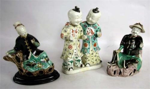 TWO POLYCHROME PORCELAIN SEATED FIGURAL GROUPS; Chinese, (losses) Together with another group of standing figures (losses and repairs) From 8"h to 9"h