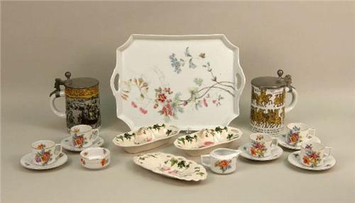 One depicting a sea battle. Together with a Czechoslovakian porcelain coffee service, comprising five cups and saucers, a sugar bowl and creamer, three English porcelain serving dishes and a Czechoslovakian porcelain tray inscribed "B.S.M." 14"h x 10"l