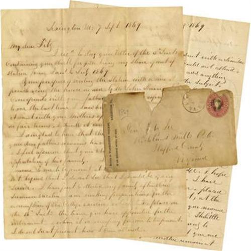 <B>ROBERT E. LEE: TWO POST-WAR AUTOGRAPH LETTERS, ONE SIGNED “R E LEE”</B></I> three pages total, 7.5” x 9.75”, Lexington, Virginia<B>, </B></I>August 5 and September 7, 1869, to Fitzhugh Lee, Stafford County, Virginia. <BR><BR>The signature from the August letter has unfortunately been clipped, resulting in significant loss to the upper section of the manuscript. The remaining content, however, is amazingly informal and regards various Lee Family members and close friends. Among those mentioned are Custis Lee, Mrs. Lee and the General’s former aide, Walter Taylor.<BR><BR>The September letter is wonderfully complete, containing over forty lines in the General’s hand that are followed by Lee’s characteristic signature. Here Fitzhugh receives more family news peppered with references to his father Sidney’s recent death. Robert Lee, ever conscious of duty, wrote in part, “…<I>I have just collected my family after their summer vacation & am making preparations for the resumption of the College exercises which take place on the 16th inst: the time you have appointed for the interment, & when it is necessary for me to be present, I do not see at present how I can attend…</B></I>”. This second letter is somewhat faded with overall browning, in very good condition.. Complete with postal cover in General Robert E. Lee’s hand.<BR><BR><B>Condition: </B></I>Very fine, but for the 4.5" x 1.5" clipped section.<BR><BR><b>Shipping:</b> Flat Material, Small (<a target="_blank" href="http://www.heritageauctions.com/common/shipping.php">view shipping information</a>)