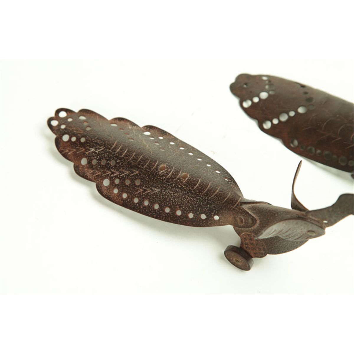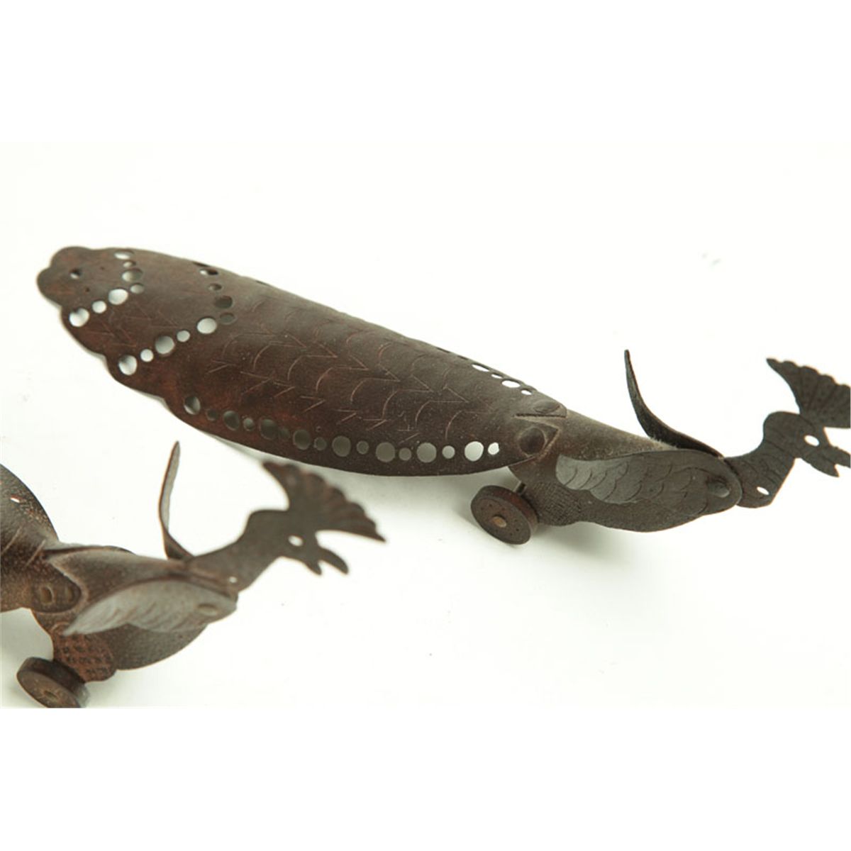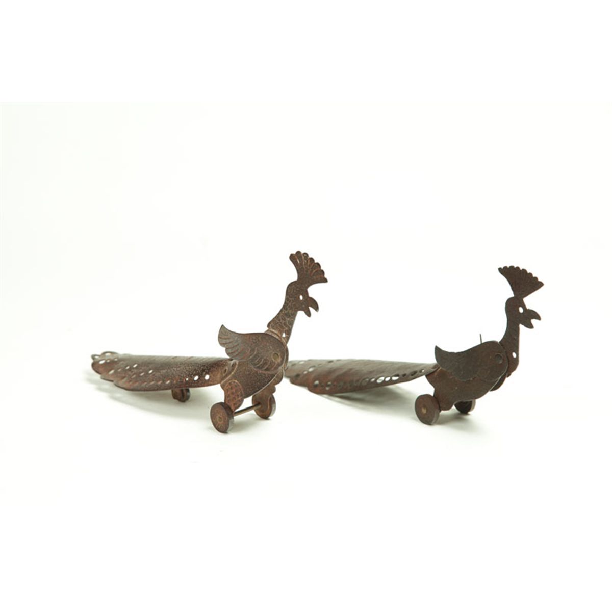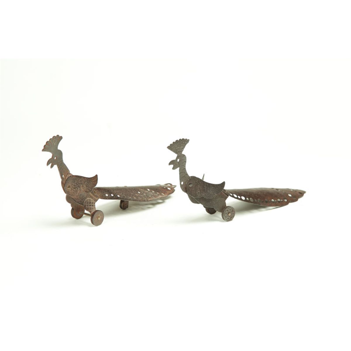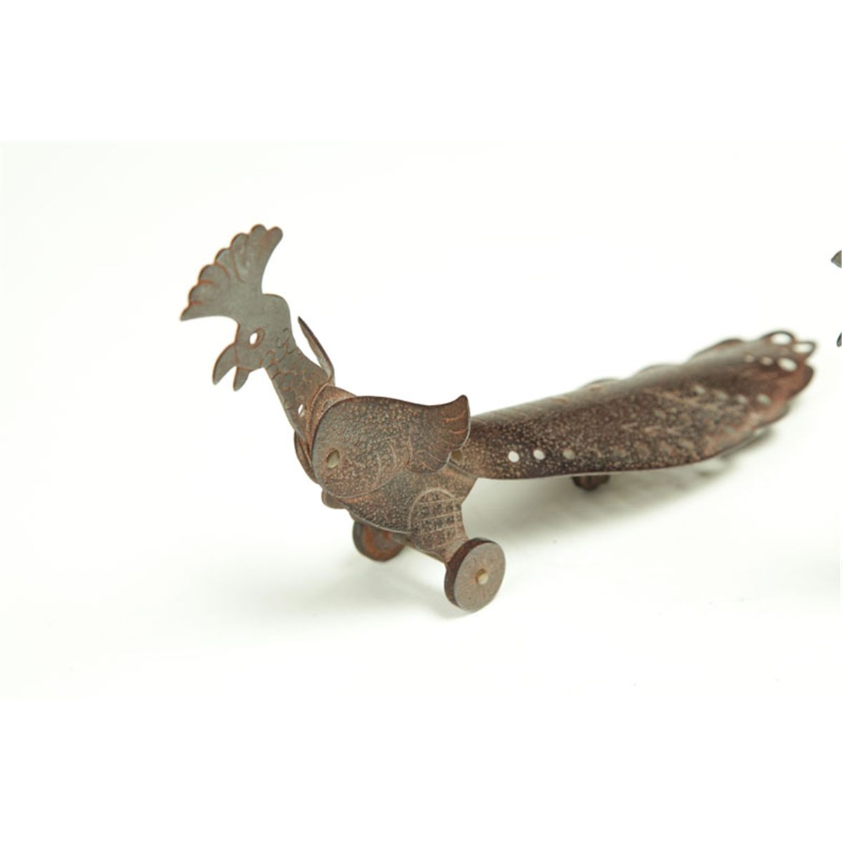 Probably 20th century, sheet iron. Similar peacocks with punched and stamped decoration and iron wheels.10"l. Purchased separately, one from Phil Hunter(Ohio).