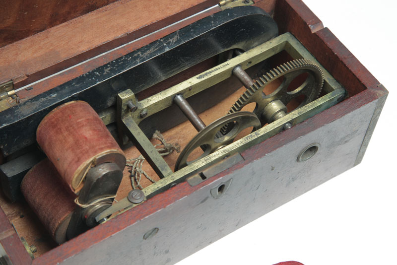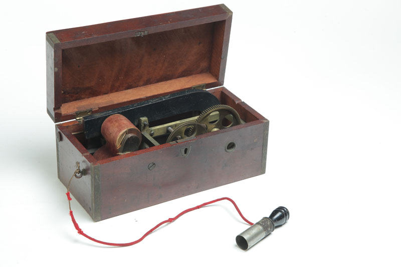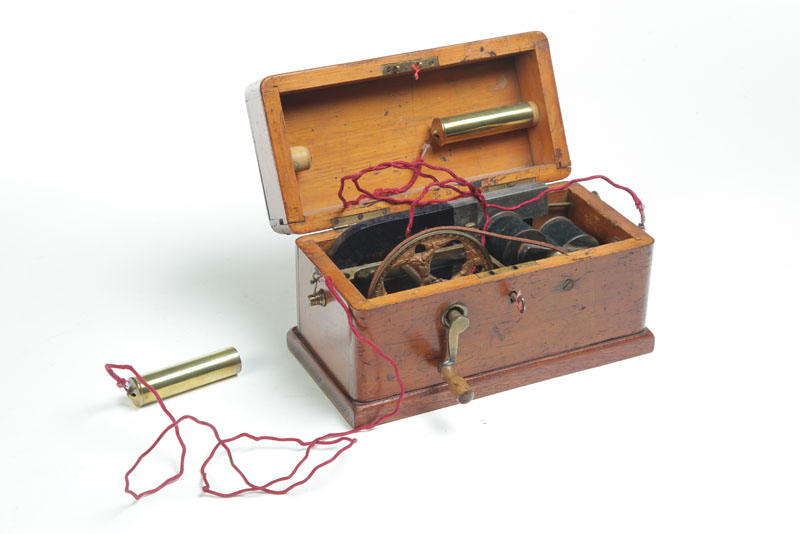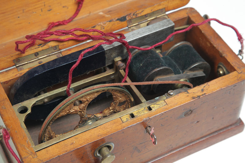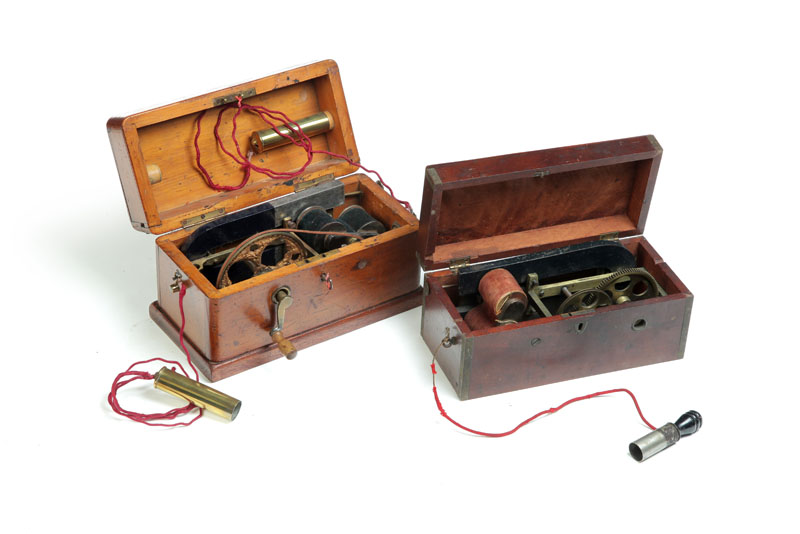 American, 19th century, wood, mixed metals. Quack medical device produces electrical current to cure nervous diseases. W.H .Burnap, New York, 2nd half-19th century, patented Apr. 18, 1854, 4 1/2"h. 10"w. 4 1/2"d., and one unmarked kit, 5 1/2"h. 10 1/4" w. 5"d. Imperfections.