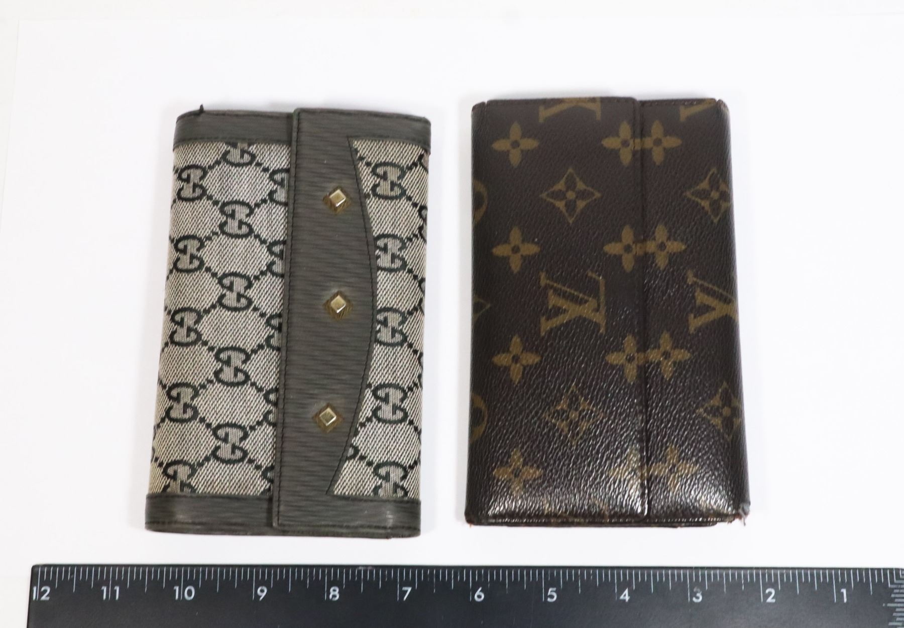 GUCCI HAS SMALL RIP TO LICENSE HOLDER POCKET. OTHERWISE BOTH IN VERY GOOD TO NEW CONDITION
