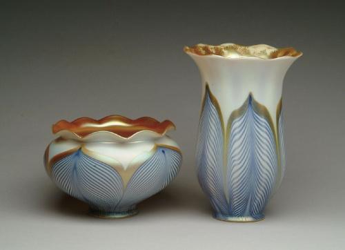 TWO QUEZAL ART GLASS SHADES. Large and squat Quezal art glass shades both having blue feather decoration bordered in gold and the larger having ribbed opal glass exterior while the squat shade has a smooth opal glass exterior. Signed on the fitter rim "Quezal". SIZE: 7 in. t and 4 in. t. CONDITION: The larger has a hairline in the body of the shade, while the squat shade has a hairline extending up from the ruffled rim and a chip out of the fitter rim. 5-61630