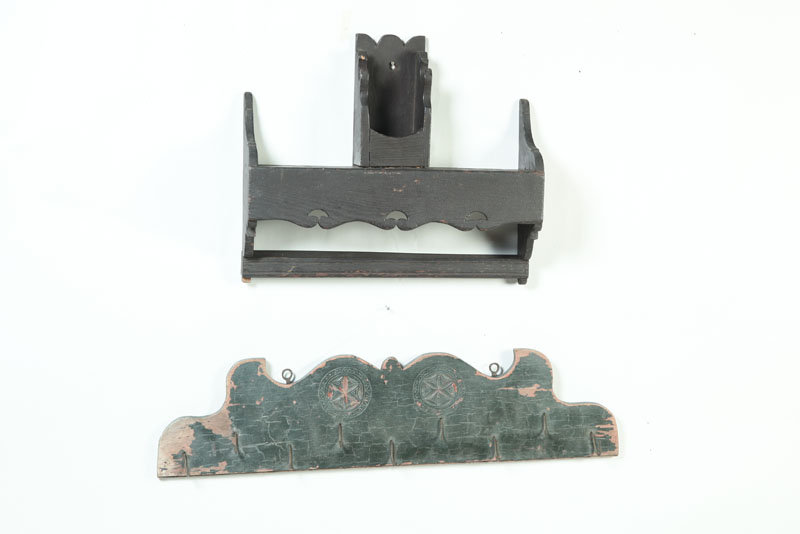 American, 18th-19th century, pine. Shaped game rack with carved compass stars and worn green paint over salmon ground, 9"h. 36"w., and a hanging rack for a mortar and pestle. Dark brown repaint. Imperfections. 19"h. 22"w.