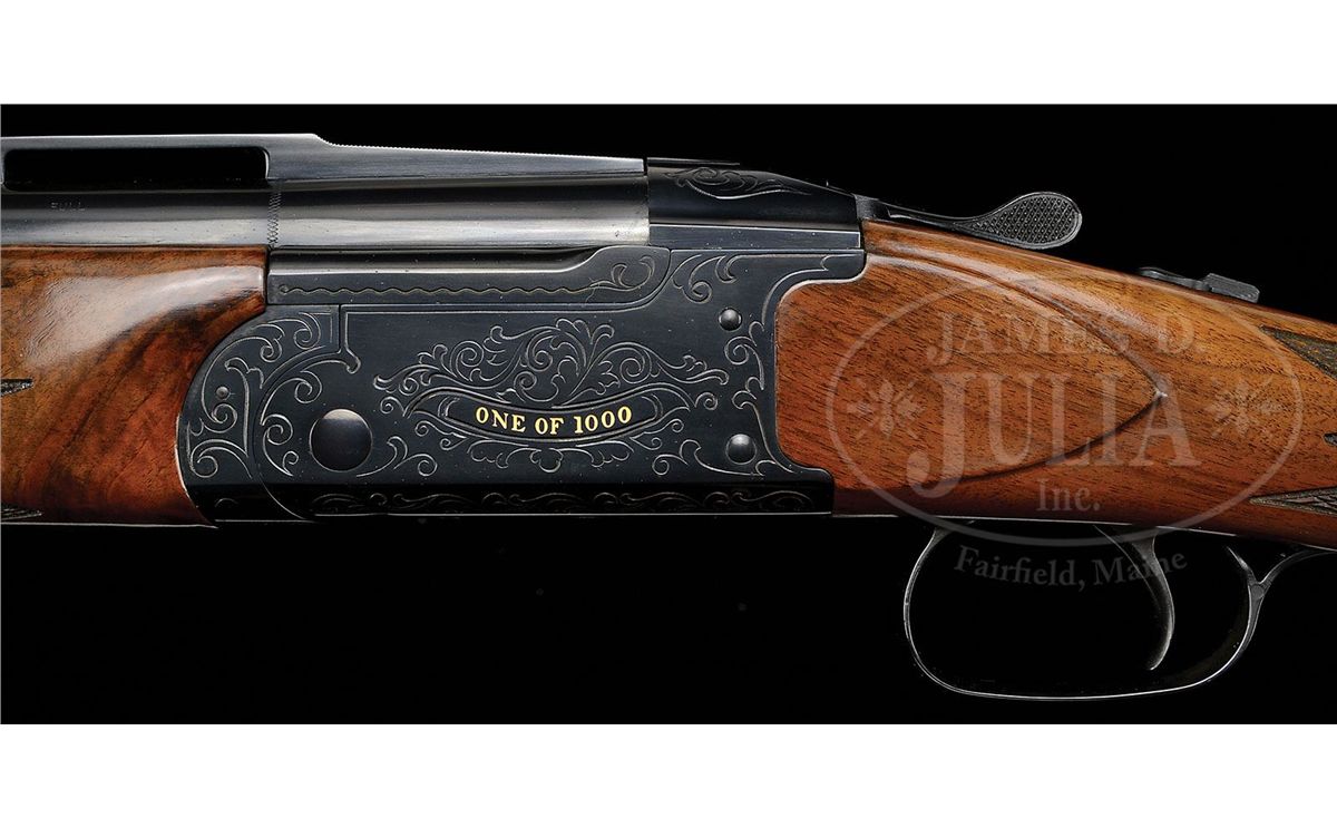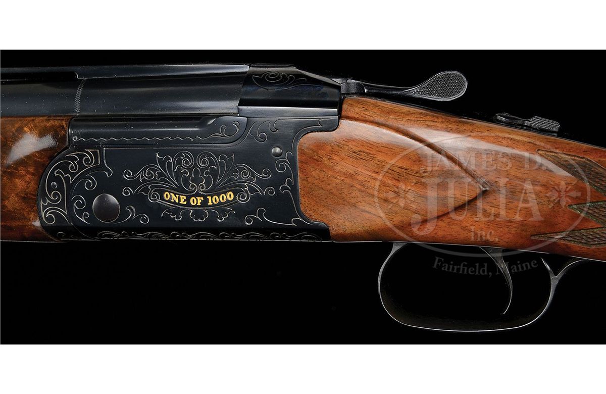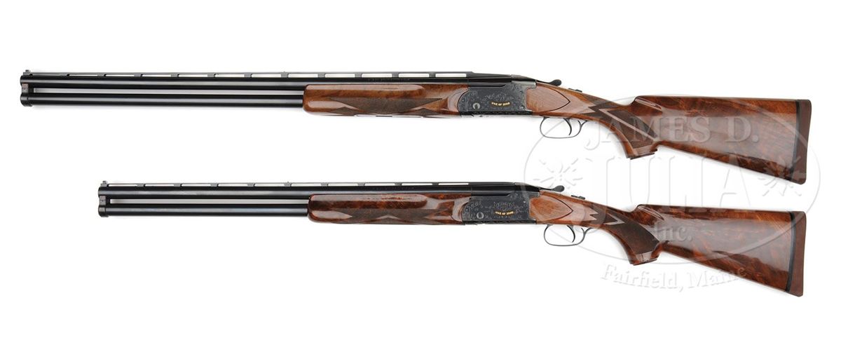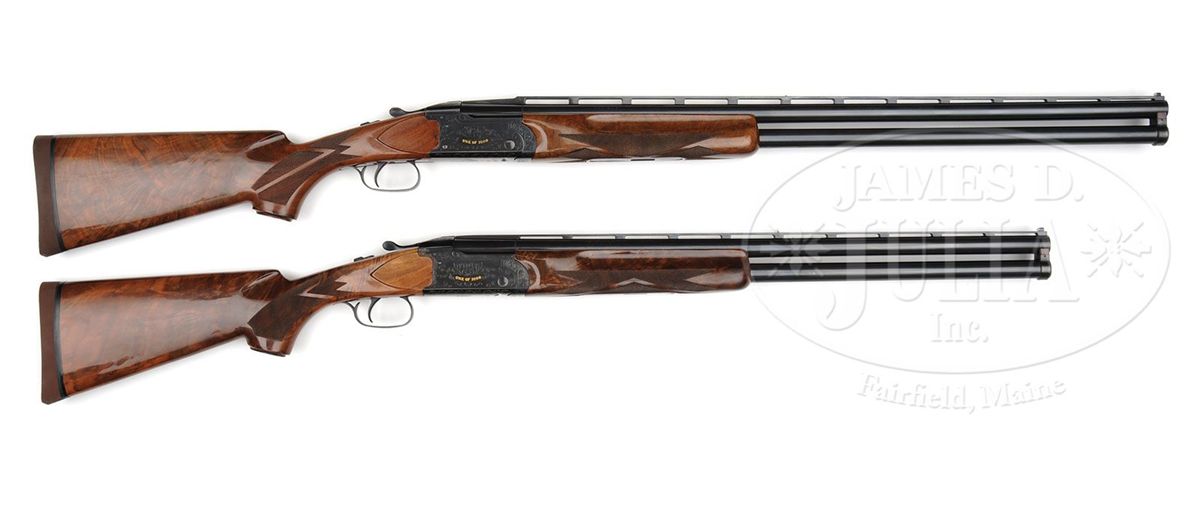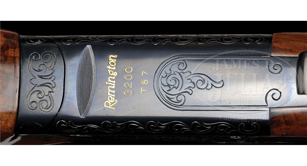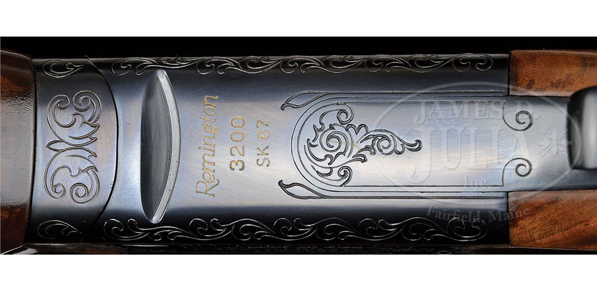 SN SK87 / T87. Cal. 12 ga. Skeet gun has 25-1/2" bbls, Trap gun has 30" bbls, both with raised, ventilated ribs, marked with gauge and chamber length as well as chokes on left side of top bbls, and with Remington name and address on right. Blued actions feature single selective triggers with toggle type selectors on top tangs, and are scroll engraved, and marked "One of 1000" in gold filled letters on each side. Bottoms of actions are marked "Remington 3200" and with SNs. Both full capped pistol grip buttstocks are of flame figured American walnut and measure 14" (Skeet) and 14-1/2" (Trap) over brown Remington solid pads. Point pattern checkering at grips have broad ribbons through patterns. Matching beavertail forends have sliding type releases. Skeet gun: Drop at heel: 1-13/16", drop at comb: 1-5/16". Weight: 8 lbs. 8 oz. LOP: 14". Trap gun: Drop at heel: 1-9/16", drop at comb: 1-3/8". Weight: 9 lbs. 2 oz. LOP: 14-1/2". Guns have their orig hang tags, and come in green plastic cases. Skeet gun case has reddish foam interior. Trap gun case has gray foam interior. Skeet gun has owners manual. Guns come in orig cardboard boxes with labels from Protecto Plastic to Remington Arms Co. End flap is marked "M3200". CONDITION: Excellent. Appear to be unfired, but there is some rusting around right rear of action and along right side of top tang on skeet gun. Cases are excellent. Boxes are good. 4-49214 MGM259
