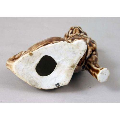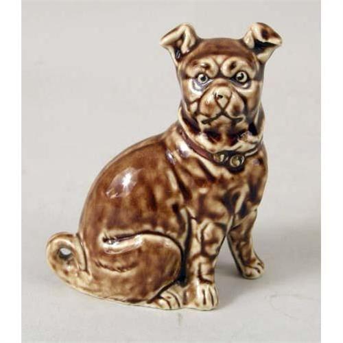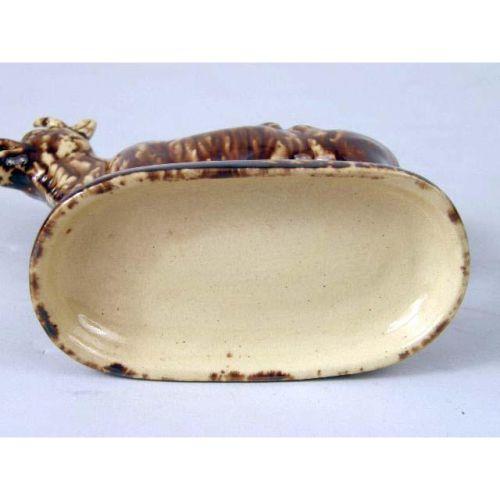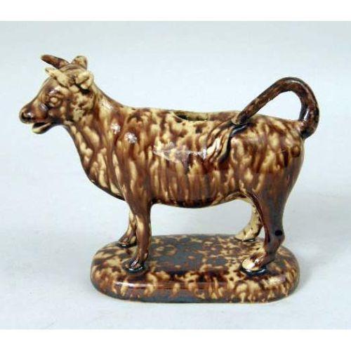TWO ROCKINGHAM WARE ITEMS<BR><BR>comprising a cow creamer and a pug figurine. Cow 6" high x 7" long x 2 3/4" wide.