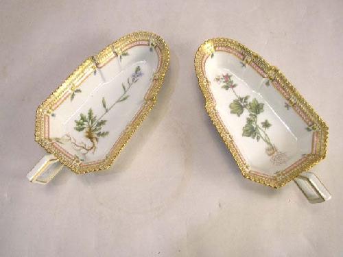 TWO ROYAL COPENHAGEN "FLORA DANICA" PATTERN PORCELAIN CONDIMENT DISHES; With gilt serrated beaded border, each central painted with specimen flowers, blue wave and green printed marks, #3542, 6-1/4"long over handle
