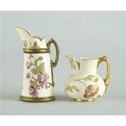 Lot 1428 TWO ROYAL WORCESTER CREAMERS. 3-1/2” bulbous with gold handle marked “1438” having yellow flower decoration and purple mark. 6” ewer type with flowers and butterfly and green mark. CONDITION: Very good. 9-96237-823 (200-400)
