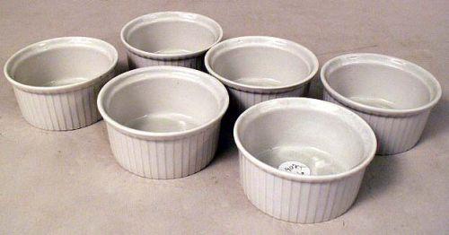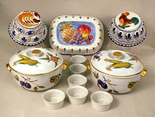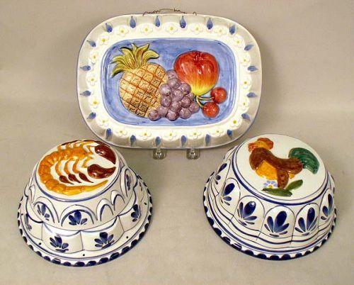 5"h. Together with six French ramekins and three ceramic molds. 11 pieces.