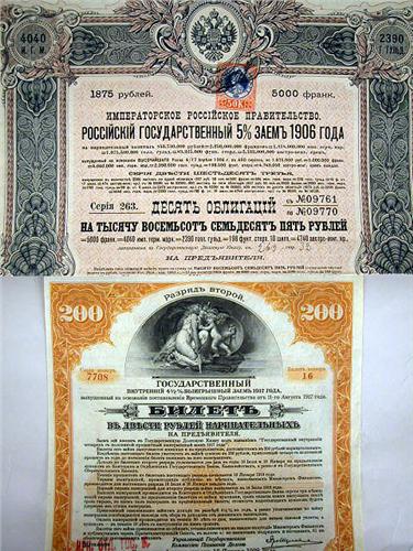 TWO RUSSIAN STOCK CERTIFICATES, CYRILLIC WRITING,
