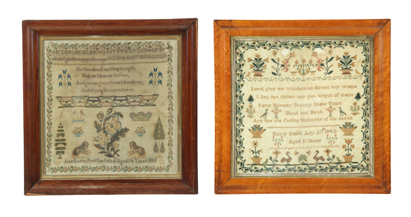 Probably English, silk on wool. One signed "Mary Smith, July 27th 1840/ Aged 11 Years" with minutely stitched pairs of flowering baskets, peacocks and pine trees and pious verse. Closely worked border. In bird's-eye frame, 15 1/2" h. 15 1/2" w. And a sampler signed "Jane Ensor Preston School Aged 14 Years 1856". Pairs of potted bluebells and spaniels with stylized floral band and large floral spray, also wrought in minute stitches. In a frame, 16 1/2"h. 16 1/4"w.