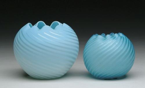 TWO SATIN GLASS ROSE BOWLS. Lot consists of blue MOP satin glass rose bowls, both having crimped tops and swirl patterns. Both are pictured in the "Collectible Glass Rose Bowls" by Johanna Billings fig. 92 and fig. 94 on pg. 39. SIZE: 3-1/2 in. and 4-1/2 in. dia. CONDITION: Very good to excellent. Collection of Johanna and Sean Billings 5-60958