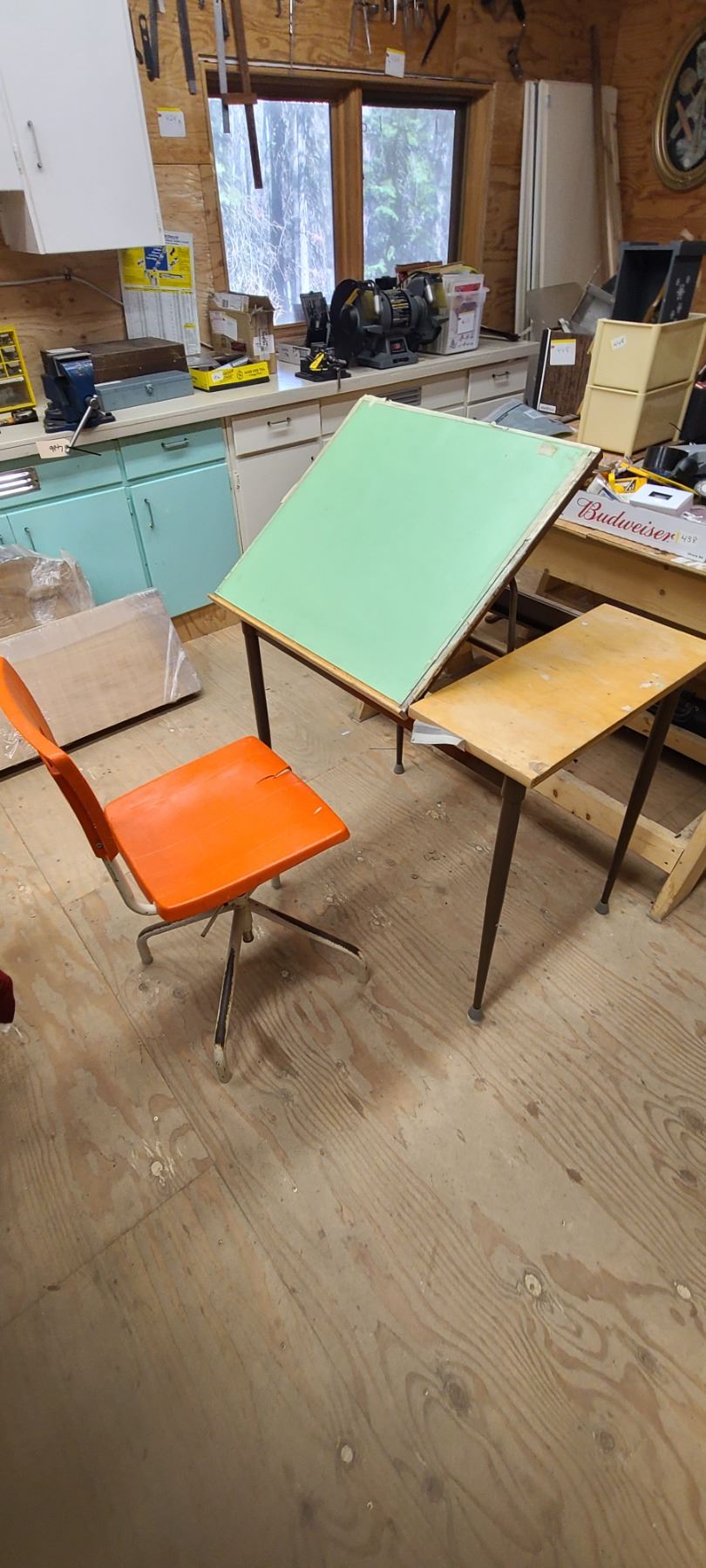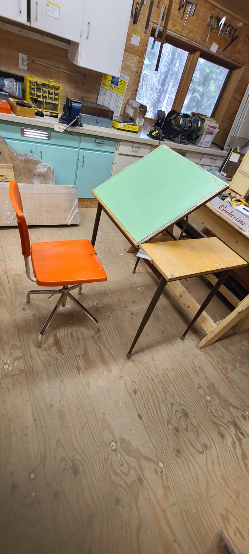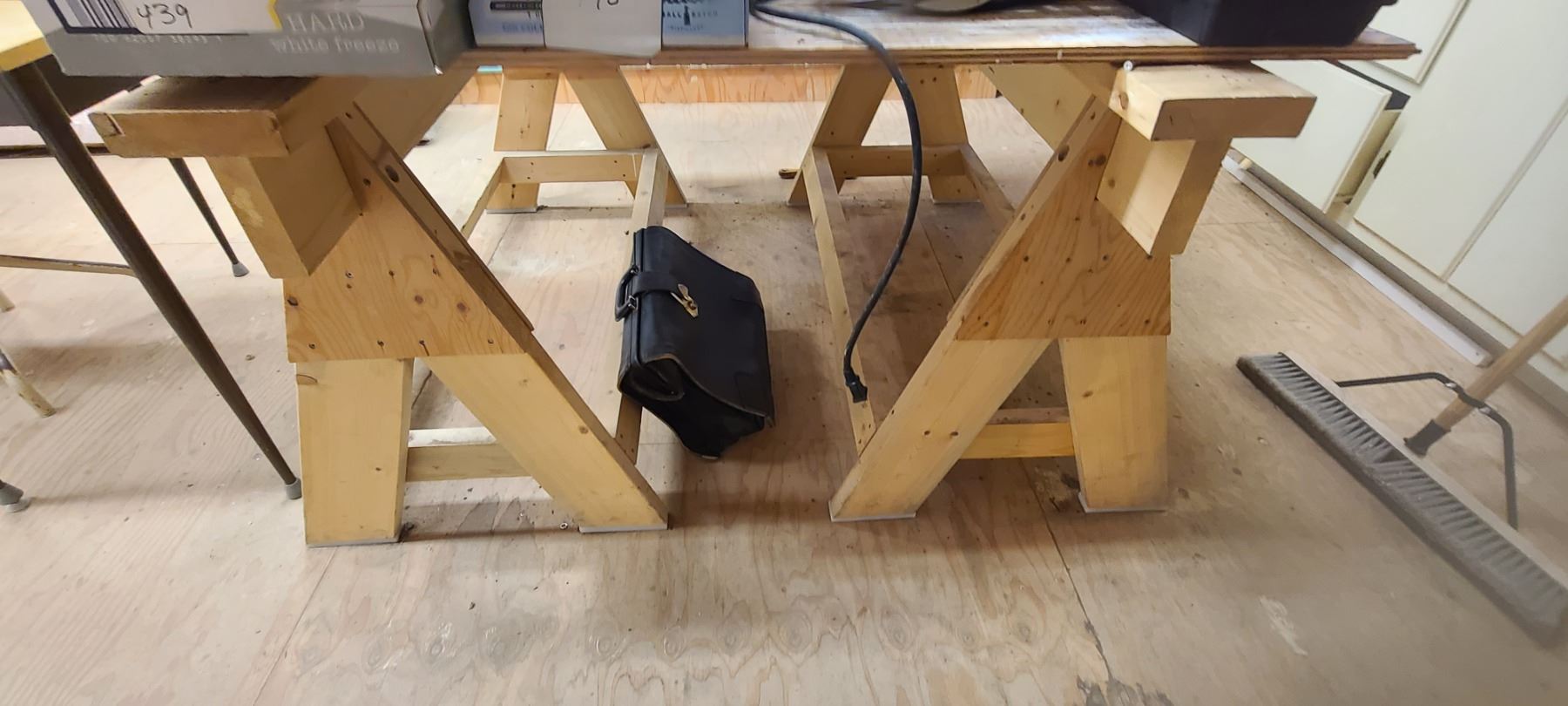TWO SAW HORSES, DRAFTING BENCH, AND CHAIR