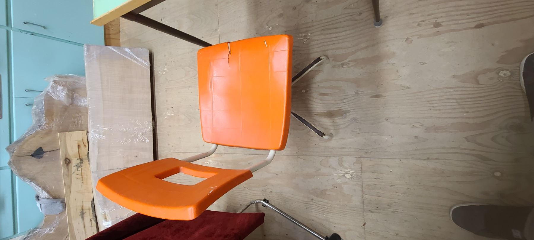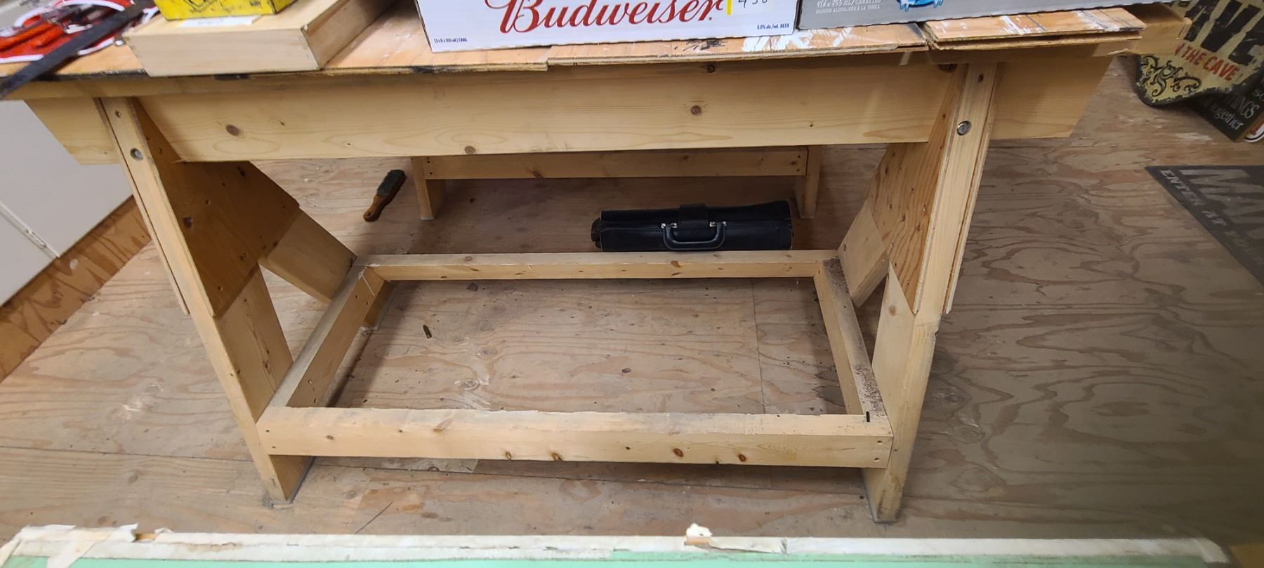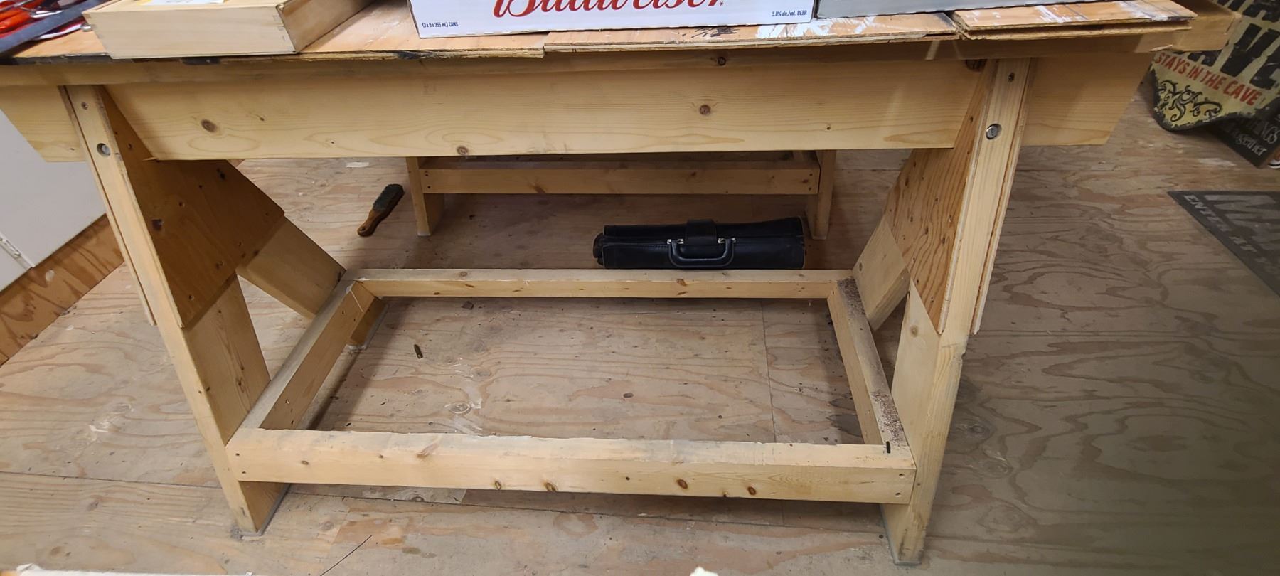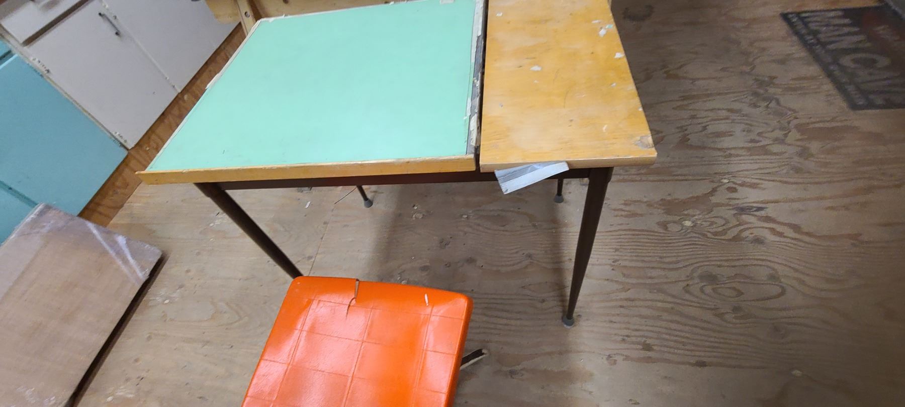 TWO SAW HORSES, DRAFTING BENCH, AND CHAIR