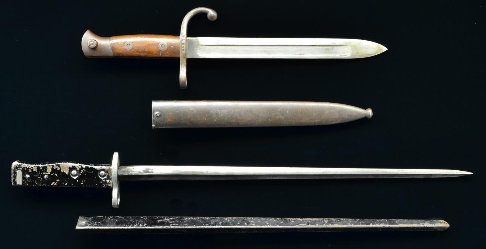 1) Unmarked 16-1/2" triangular blade bayonet. Made in Belgium for export w/ stamped metal grips resembling the German WWI ERSATZ bayonets. The blades were reportedly made from earlier socket bayonet blades. Straight crossguard w/ muzzle ring. Steel triangular scabbard w/ belt hook. CONDITION: blade has wear, scattered oxidation & fine pitting. Black painted grip has extensive flaking & wear. Steel scabbard has flaking black paint turning patina w/ light oxidation. 2) Belgian Model 1889 "short" bayonet. 9-3/8" Fullered single edge blade which is marked only w/ very faint tiny inspector's mark resembling "Crown JD". Crossguard w/ muzzle ring & curved quillion. Marked on right side w/ "F" & left side w/ "U639". Smooth walnut grips. Bird's head pommel. Steel scabbard. Belt hook is marked "F U 639". CONDITION: bright blade has wear, staining & very light oxidation. Balance of parts are gray & patina. Grips have moderate wear & handling marks. Steel scabbard is blue turning patina w/ wear & light scratches. (02-16392-1/RW) $400-600.