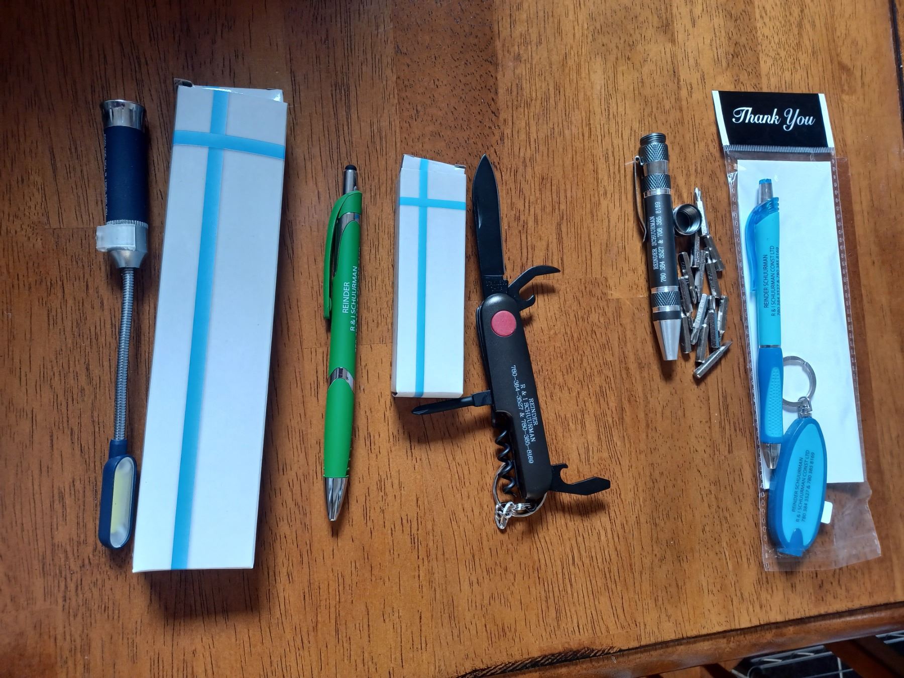 TWO SCREWDRIVERS, THREE FLEXIBLE KNIVES, TEN POCKETKNIVES, FIVE PENS, AND FOUR KEYCHAIN LED LIGHT