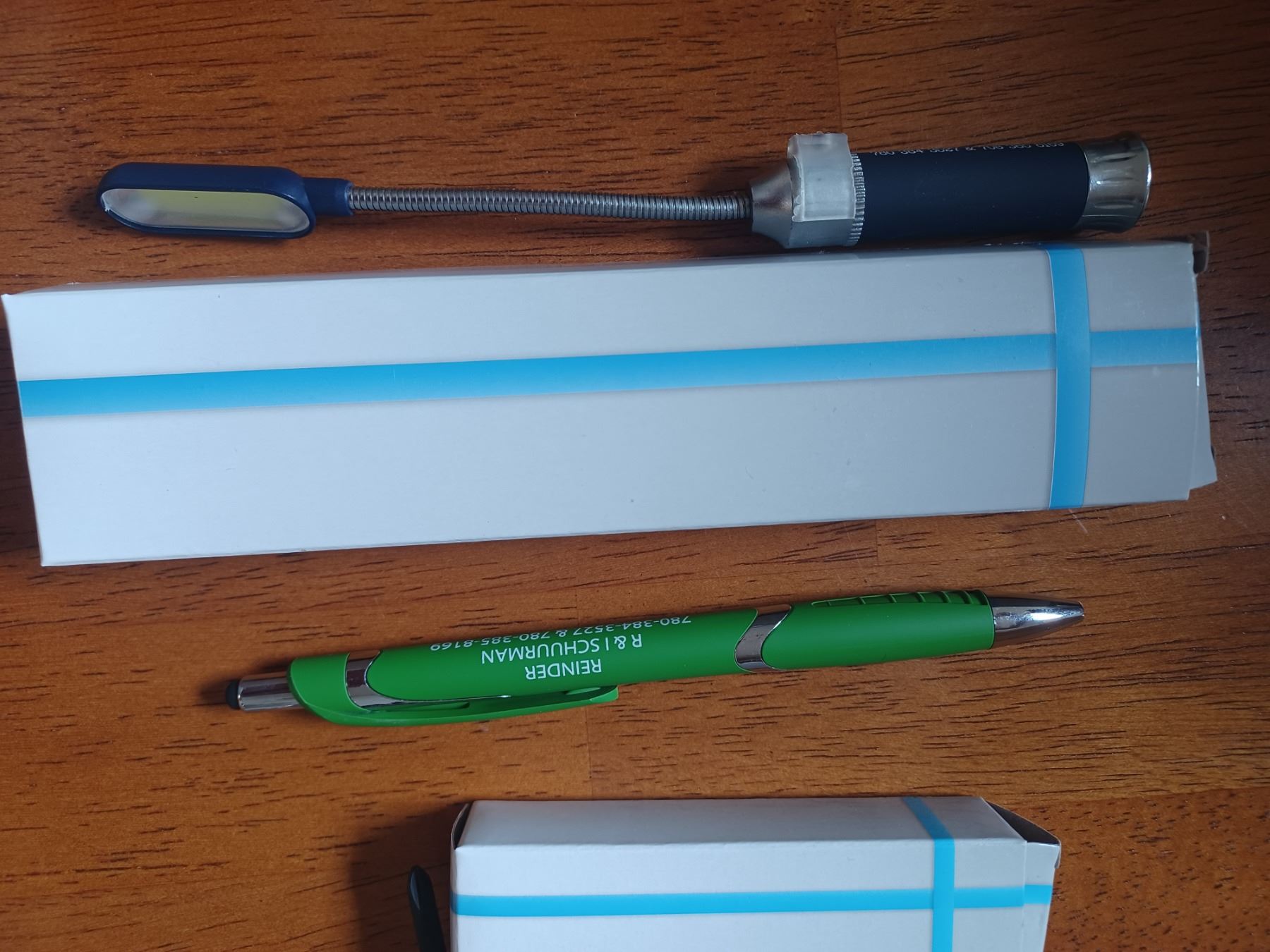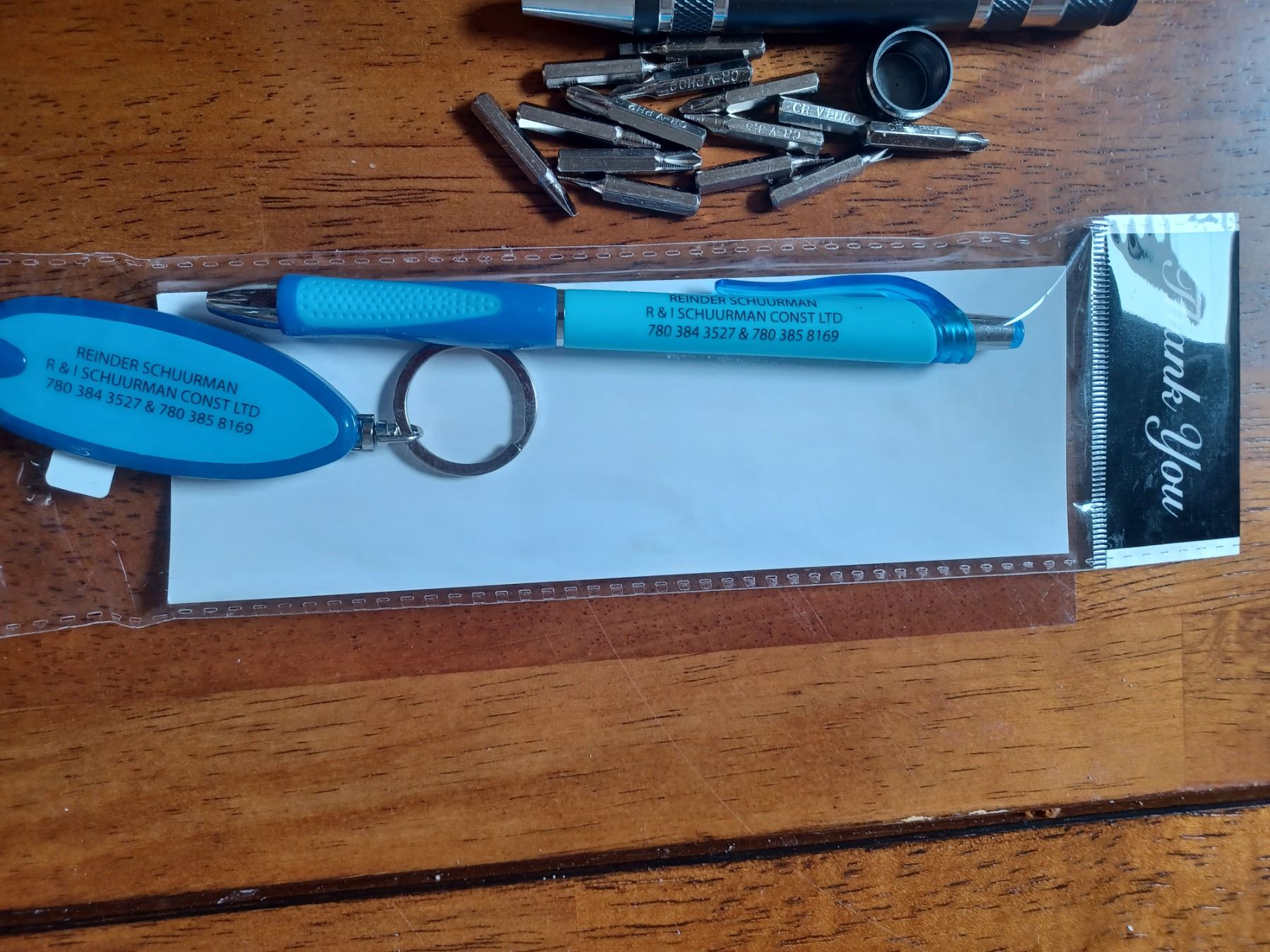 TWO SCREWDRIVERS, THREE FLEXIBLE KNIVES, TEN POCKETKNIVES, FIVE PENS, AND FOUR KEYCHAIN LED LIGHT