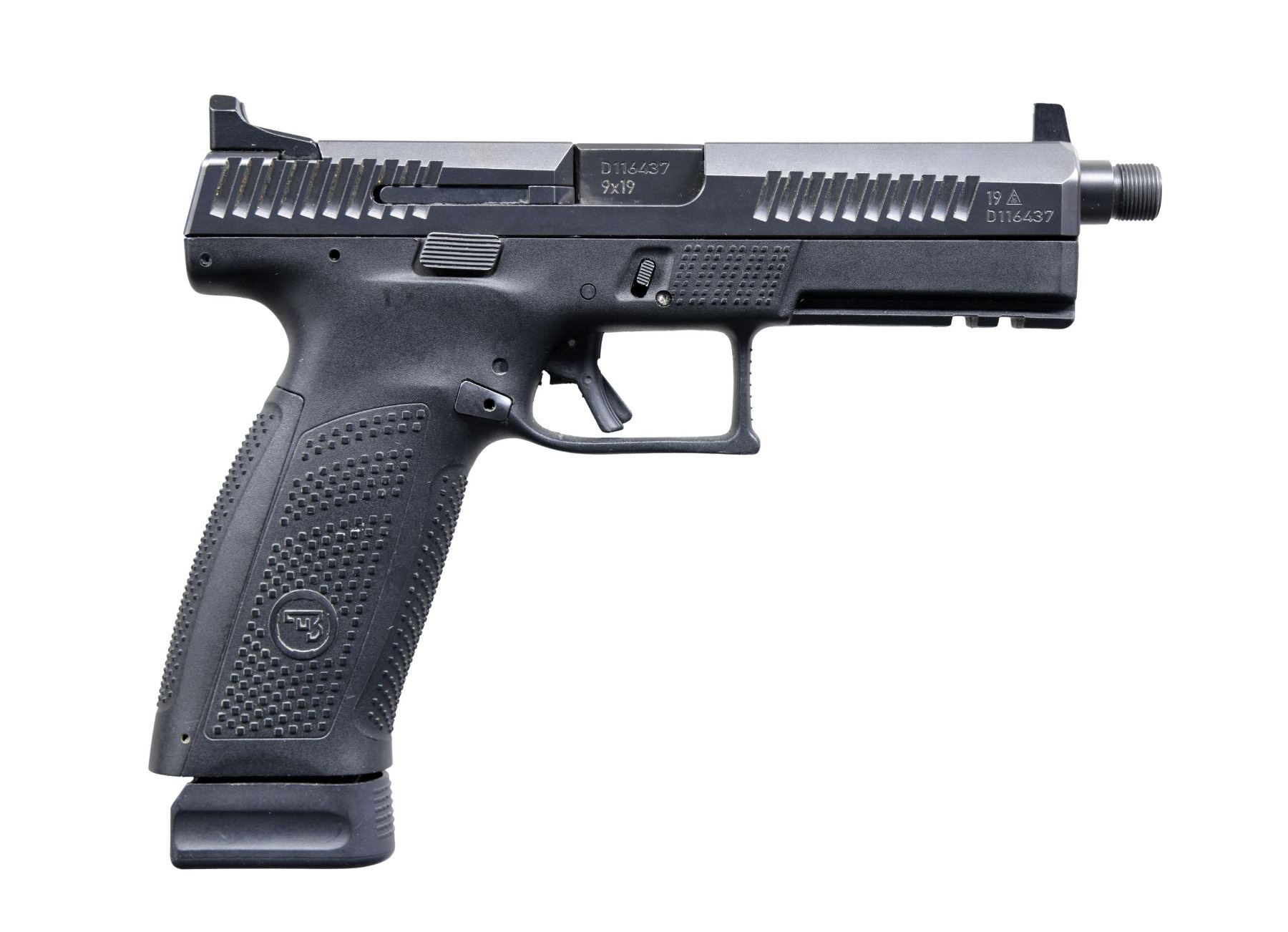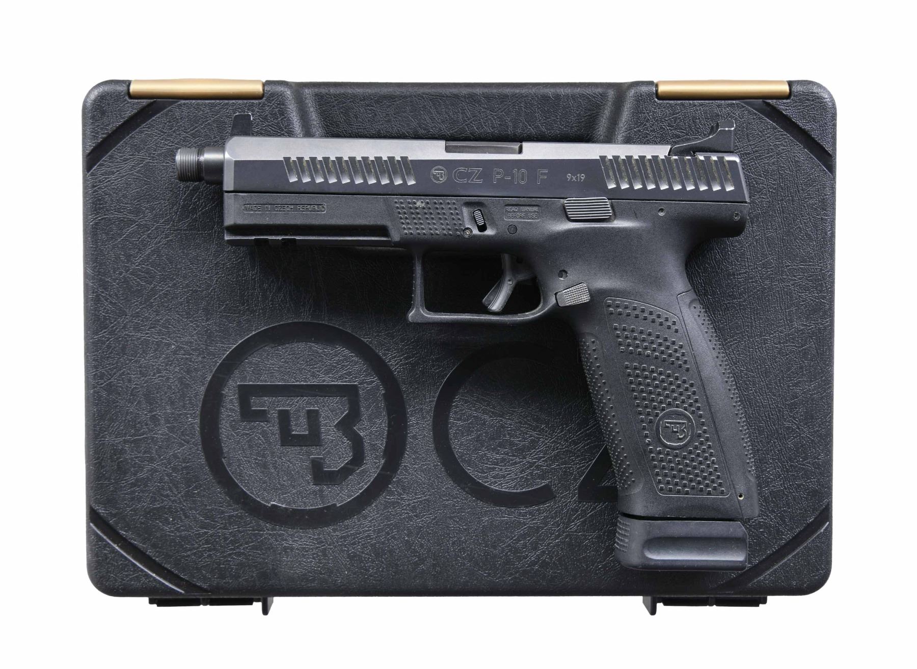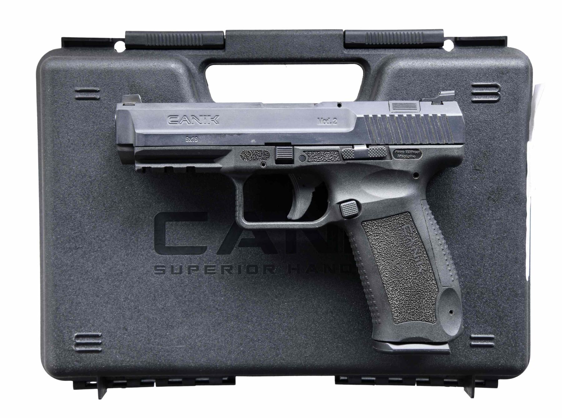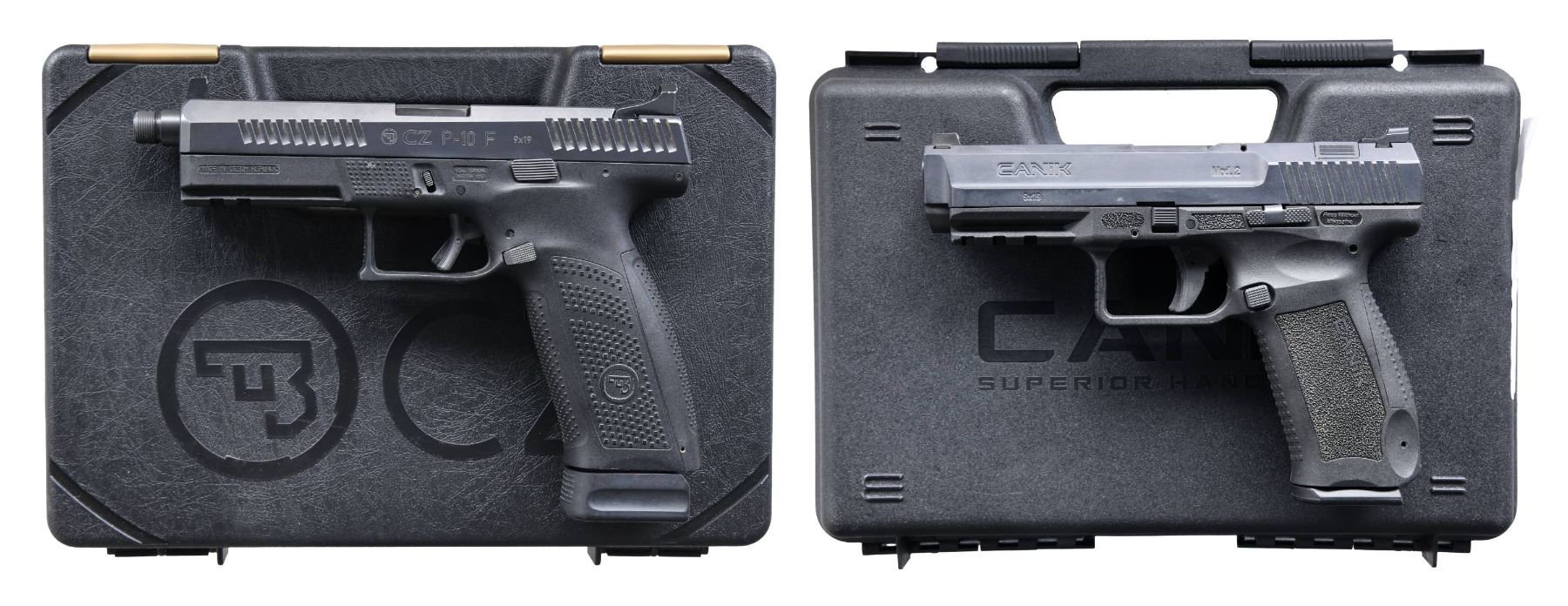 HARD CASES. 1) CZ MODEL P-10F. Cal. 9x19mm. S# D116437. Bbl. 5". Model P-10F semi-automatic pistol mfg. in the Czech Republic by CZ and imported by CZ-USA. Left side of the slide is marked with the CZ logo, followed by the model and cal. designations, with the S# marked on the right. Slide and threaded bbl. exhibit a blue finish. Textured black polymer frame. Raised white dot front sight with raised square notch rear sight. All serialized parts are matching and include the frame, slide, and bbl. MAGS: two 18-rd. UNATTACHED ACCESSORIES: Matching factory hard case. CONDITION: Good, with some spots of light to mild wear overall. Mirror bore, exhibiting some firing residue, while retaining strong rifling throughout. Frame shows a few scattered marks from handling and storage, but otherwise remains sturdy and serviceable. (24-7036/MLW). MODERN. 2) CANIK TP9SA MODEL 2. Cal. 9x19mm. S# 21AP18281. Bbl. 4 3/8". TP9SA Model 2 semi-automatic pistol mfg. in Turkey and imported by Century Arms. Left side of the slide is marked "CANIK" above the cal. designation, followed by "Mod.2", with the model designation, S#, and Century Arms' importer information marked on the right. Metal components exhibit a dull blue finish. Textured black polymer frame, featuring a picatinny rail, just forward of the trigger guard. White dot blade front sight with U-notch rear sight. All serialized parts are matching and include the frame, slide, and bbl. MAGS: two 18-rd. UNATTACHED ACCESSORIES: Matching black hard case, containing a black polymer holster and mag. loader. CONDITION: Very good, with metal components retaining the majority of their original factory finish, exhibiting some light surface oxidation and a few superficial handling marks overall. Mirror bore, exhibiting some spots of hardened firing residue, while retaining strong rifling throughout. Polymer frame shows a few light marks from handling and storage, but otherwise remains sturdy and serviceable. (24-7037/MLW). MODERN. $700-1,100.