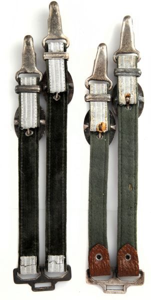 Two sets of WWII German army dress dagger hangers. Both "DRGM" marked, one with leather connectors to straps, the other with straps connected directly to coupler. Both in very good condition. This lot has a reserve.