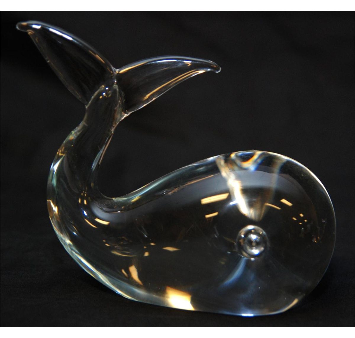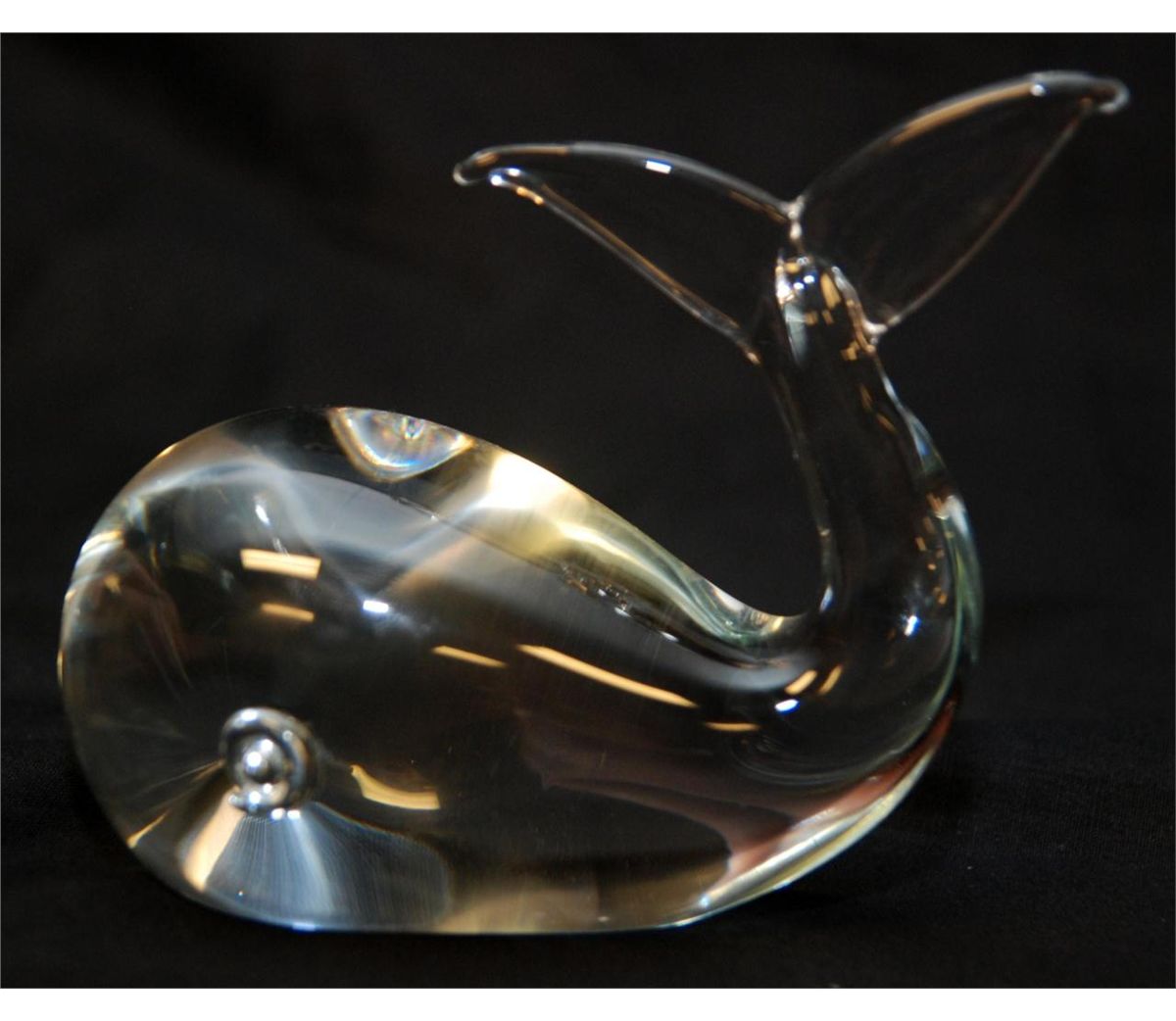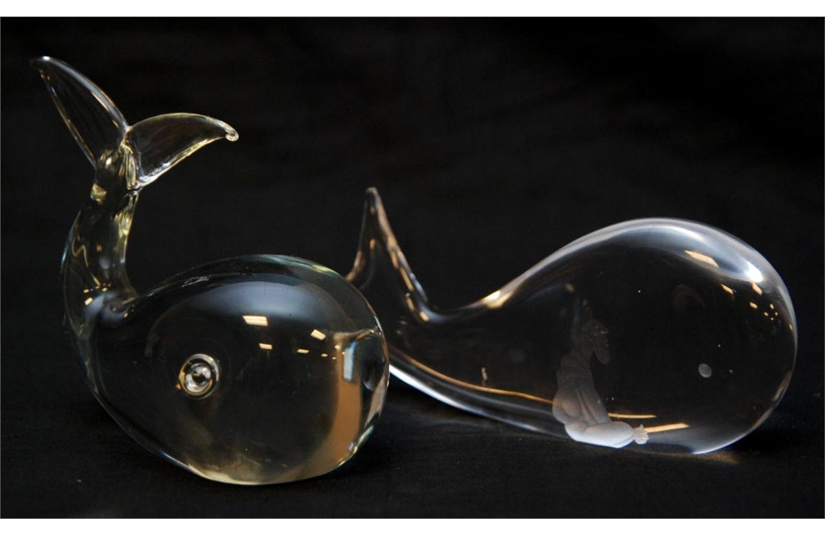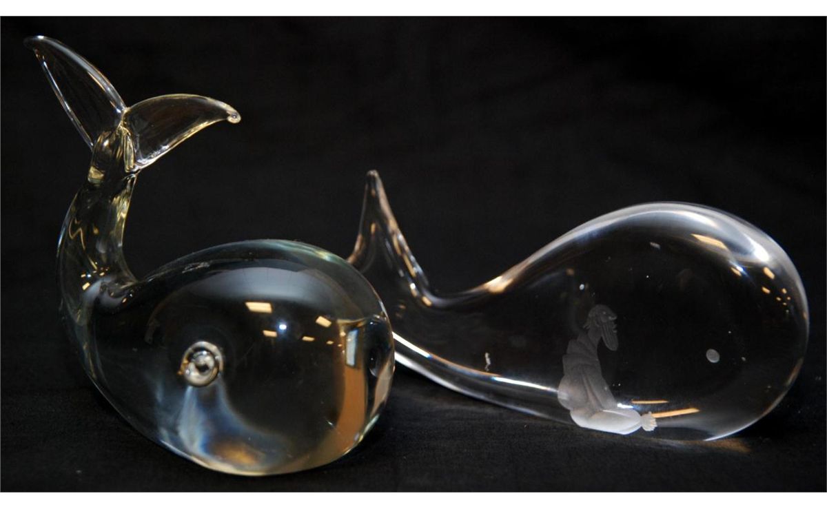 Two glass figural whale paperweights. Each signed to bottom. One signed Kosta Boda. Largest measures 5" height (12.7cm). Total weight of 1.52 kilograms.