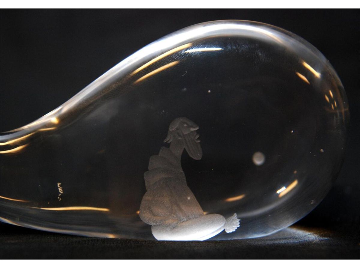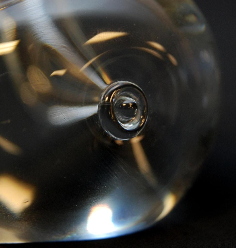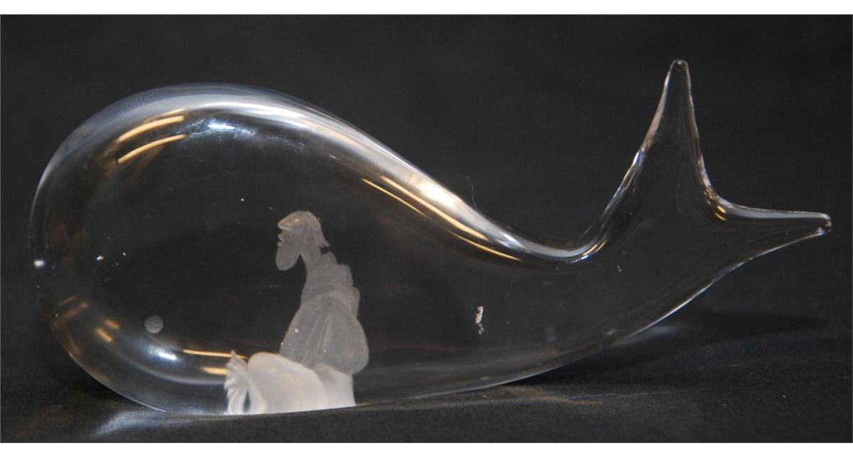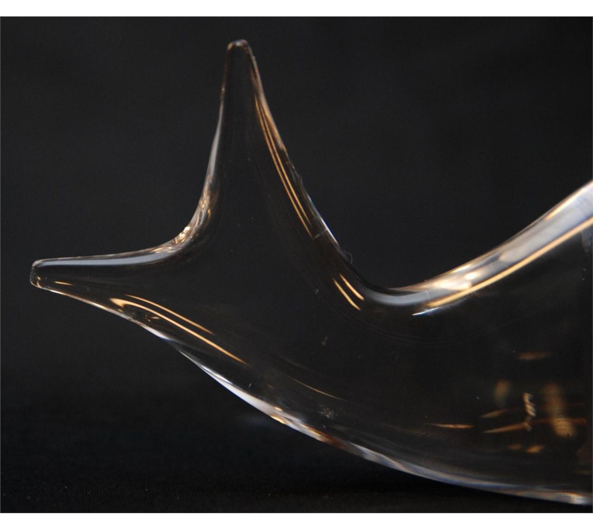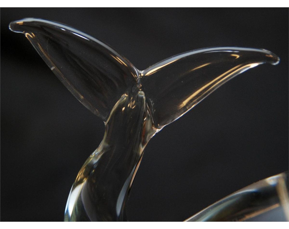 Two glass figural whale paperweights. Each signed to bottom. One signed Kosta Boda. Largest measures 5" height (12.7cm). Total weight of 1.52 kilograms.