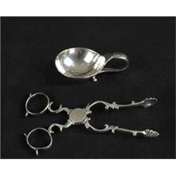 Lot 104 TWO SILVER ARTICLESTWO SILVER ARTICLES. 1) George Jensen Danish hand hammered individual salt? Wine taster form with round bowl having looped handle ending in small ball feet. Hallmarked and dated “1931”. Model No. 110. SIZE: 2”. CONDITION: Very good. 2) Pair of unmarked silver sugar tongs. Scissor form with clamshell ends and scroll design. SIZE: 4-1/2” l. CONDITION: Some bends, otherwise very good. 12-15 (100-200)