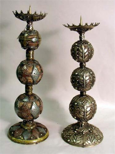 TWO SILVER-DECORATED STONE PRICKET STICKS; tallest 28"h