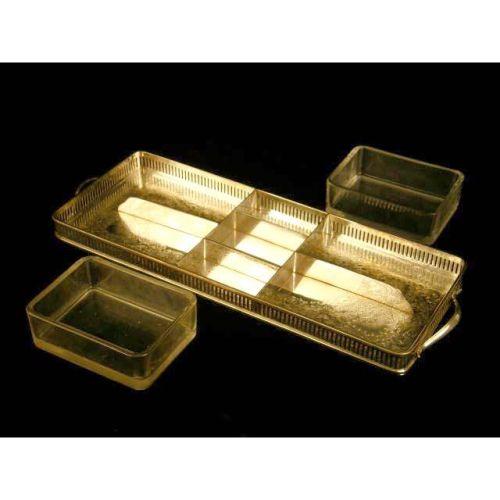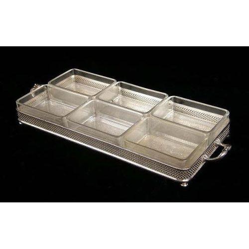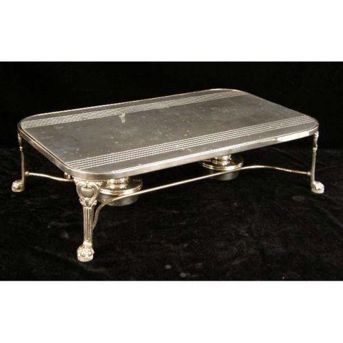 TWO SILVER PLATED HANDLED TRAYS<BR><BR>With glass inserts, largeer, 16-3/4"long over handles, together with a footed warming stand with two burners, 17"long