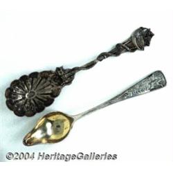 <B>TWO SILVER SALEM WITCH SOUVENIR SPOONS</B></I><BR>Mark of Daniel Low, Salem, Massachusetts, c.1900<BR><BR>Consisting of one sugar shell, and one citrus spoon, citrus spoon handle with a witch upon a broom pointing forward, citrus bowl undecorated, the sugar shell handle features a witch upon a broom, a quarter moon, and cat at opposite end, bowl undecorated, <I>marked reverse of handle</B></I><BR>the longest, 5.75in. 2 Items <BR><BR><B>Important notice:</B> Heritage usually auctions material at the rate of 200-250 lots per hour. On some occasions eBay Live bid software or the Internet may not be able to keep up with the pace of the auction. We recommend placing a realistic absentee bid now as insurance to avoid disappointment. Occasionally the auctioneer may eliminate or reject an eBay Live bid, and the auctioneer may also reopen a lot after the close of the eBay live bidding (usually because we missed an audience bid), and may reject your bid even if it shows you as the winning bidder. By bidding via eBay Live, you agree that Heritage may award the lot to another bidder at its sole discretion under the circumstances described above or any other reasonable circumstances. Since eBay bids are not shown to us until we open the lot on the floor, we treat those bids just like floor bids. In most cases the floor responds before the eBay bid is presented to us, due to Internet lag time, so for consistency we have made it a policy that floor bids are always considered first over tie eBay live bids. Also please note that all Heritage lots purchased through eBay Live carry a 25% Buyer's Premium. Please make sure you read the Terms and Conditions before you bid. <BR><BR><B>IMPORTANT ANNOUNCEMENT ABOUT RESERVES:</B> Heritage now divulges all reserves on its web site 7 days before every auction. If you want to know whether the reserve on this lot has been met, and if not, what the reserve amount is, please visit this lot page on the HeritageCoin.com web site, or email: bid@HeritageGalleries.com </span></font>