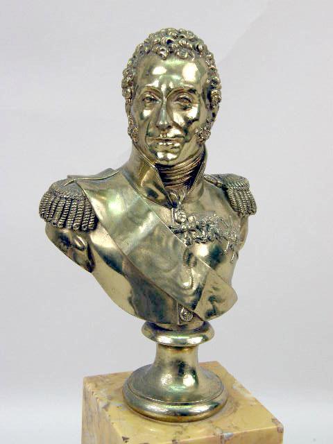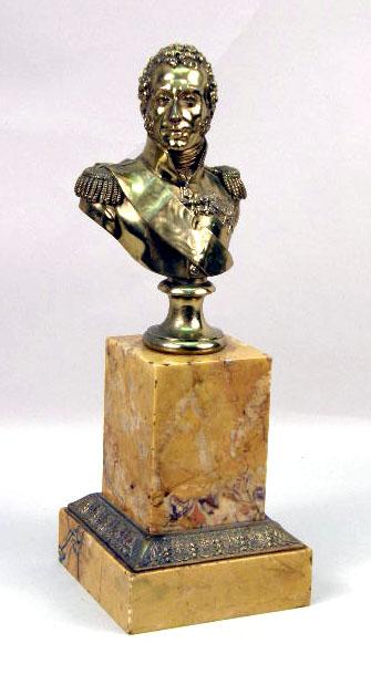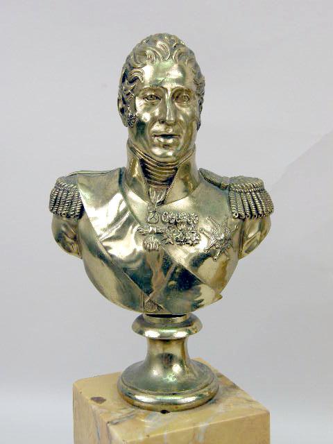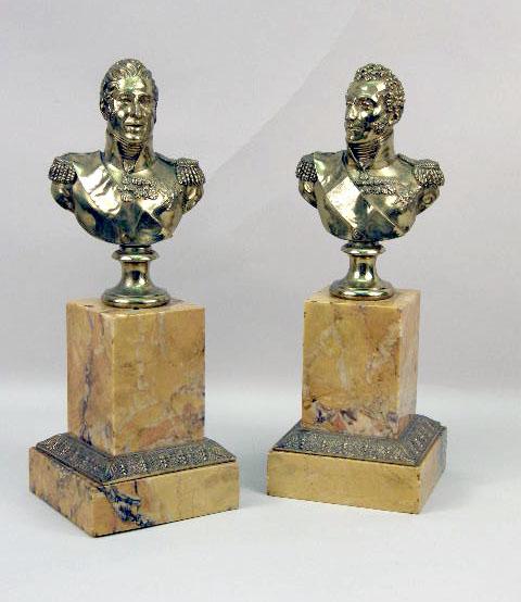French, depicting busts of military officers. 14 1/2"h x 5"w x 5"d Chips to marble, wear to brass.