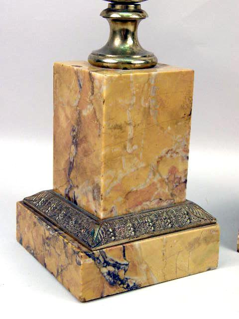 TWO SIMILAR BRASS AND MARBLE GARNITURES